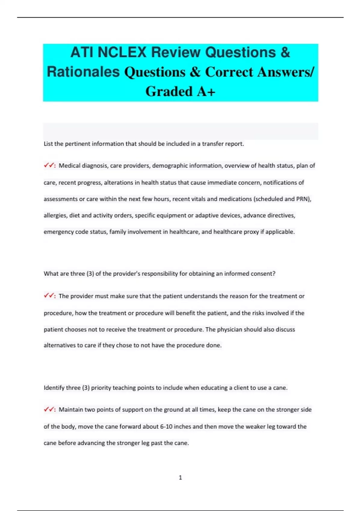 List the pertinent information that should be included in a transfer report. : Medical diagnosis, care providers, demographic information, overview of health status, plan of care, recent progress, alterations in health status that cause immediate concern, notifications of assessments or care within the next few hours, recent vitals and medications (scheduled and PRN), allergies, diet and activity orders, specific equipment or adaptive devices, advance directives, emergency code status, family involvement in healthcare, and healthcare proxy if applicable. What are three (3) of the provider's responsibility for obtaining an informed consent? : The provider must make sure that the patient understands the reason for the treatment or procedure, how the treatment or procedure will benefit the patient, and the risks involved if the patient chooses not to receive the treatment or procedure. The physician should also discuss alternatives to care if they chose to not have the procedure done. Identify three (3) priority teaching points to include when educating a client to use a cane. : Maintain two points of support on the ground at all times, keep the cane on the stronger side of the body, move the cane forward about 6-10 inches and then move the weaker leg toward the cane before advancing the stronger leg past the cane. 2 The nurse is teaching a new parent appropriate finger foods to introduce around nine (9) months. Identify five (5) finger foods that would be appropriate to introduce at nine (9) months. : Ripe bananas, graham crackers, noodles, pears, peaches How should the nurse respond when the client requests information about meditation? : Meditation uses rhythmic breathing to calm the mind and the body. A client is at risk for a deep vein thrombosis. What is the priority assessment for this client? Describe the procedure to use when applying elastic stockings (TEDS). : Perform hand hygiene. Assess skin, circulation, leg edema. Measure calf/thigh circumference and the length of the leg to select correct TEDS size. Turn the stockings inside to the heel, place on the foot, pull the remainder of the stocking over the heel and on the leg, smoothing any creases or wrinkles. Remove every 8H to assess for redness, warmth, tenderness. Keep clean/dry. Document presence of TEDS. A client has been prescribed a mechanical soft diet. What are three (3) indications for this therapeutic diet? : Mechanical soft diet includes clear and full liquids plus diced and ground foods, indicated by trouble chewing/swallowing, difficulty moving or loss of feeling in areas of the mouth, or surgery in the mouth. 3 The nurse has been assigned to a post-abdominal surgery client who has also been diagnosed with dementia. The family is concerned about pain control for the client because the client is confused. What should the nurse include in their teaching to the family about the pain control plan for this client? : Vital signs are indicative of pain, therefore assessed frequently. Explain behavioral changes due to the dementia which may indicate pain. Pre-medicate the patient prior to activities and before pain is expected. It is important for the family to understand that there are pain scales that can be used to help determine if pain medication is needed. A client reports difficulty falling asleep. What are nursing interventions to promote sleep? : Promote a bedtime routine, exercise at least 2H before bedtime, personal hygiene needs to promote comfort, muscle relaxation if anxious/stressed A nurse is conducting an admission assessment for an older adult client with a hearing impairment. What are some strategies the nurse can use to improve communication with this client? : Face the patient and speak slower in a normal volume, do not approach the patient from behind, make sure the patient is aware you are speaking before you initiate conversation. The physician prescribes meperidine 25 mg IM now for a client's pain. Available: Meperidine 100 mg/mL How much meperidine will the nurse administer? : 25 mg * 1mL/100mg = 0.25m