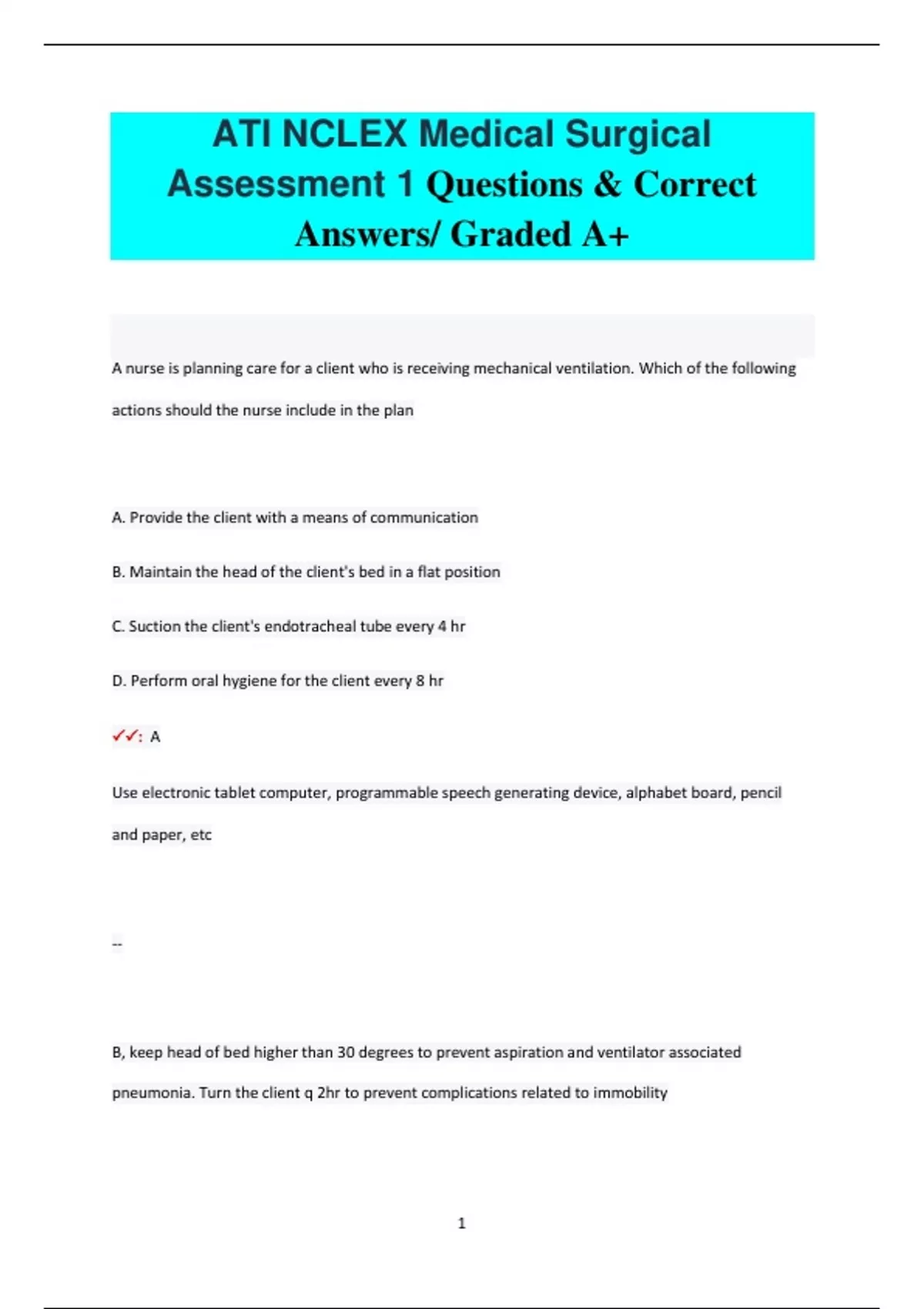A nurse is planning care for a client who is receiving mechanical ventilation. Which of the following actions should the nurse include in the plan A. Provide the client with a means of communication B. Maintain the head of the client's bed in a flat position C. Suction the client's endotracheal tube every 4 hr D. Perform oral hygiene for the client every 8 hr : A Use electronic tablet computer, programmable speech generating device, alphabet board, pencil and paper, etc -- B, keep head of bed higher than 30 degrees to prevent aspiration and ventilator associated pneumonia. Turn the client q 2hr to prevent complications related to immobility 2 C, assess the need to suction q 2-4 hr, but not perform routine suctioning. Base the need for suctioning on assessments, not a schedule. Unnecessary suctioning can cause bronco spasms and injury tracheal mucosa D, oral hygiene should be performed q 2 hr to decrease the risk of ventilator associated pneumonia A nurse is caring for a client who is receiving IV fluid replacement therapy for dehydration. Which of the following laboratory results indicates effectiveness of the treatment A. Sodium 165 mEq/L B. Potassium 5.2 mEq/L C. Urine specific gravity 1.020 D. Hct 62% : C Within the expected range of 1.005-1.030 -- A, sodium range is 136-145 B, potassium range is 3.5-5 3 D, Hct range is 37%-52% A nurse is monitoring the laboratory findings for a client who is postoperative following a total hip arthroplasty 6 hr ago. Which of the following values indicates that the client has an increased risk for bleeding A. PT 11.5 seconds B. aPTT 35 seconds C. Platelets 80,000 D. RBC 4.0 million : C platelet range is 150,000-400,000 -- A, PT range is 11-12.5 B, aPTT range is 30-40 seconds D, RBC range is 4.2-6.1 million. A low RBC can indicate that bleeding has occurred, but it does not indicate that the client is at risk for bleedin