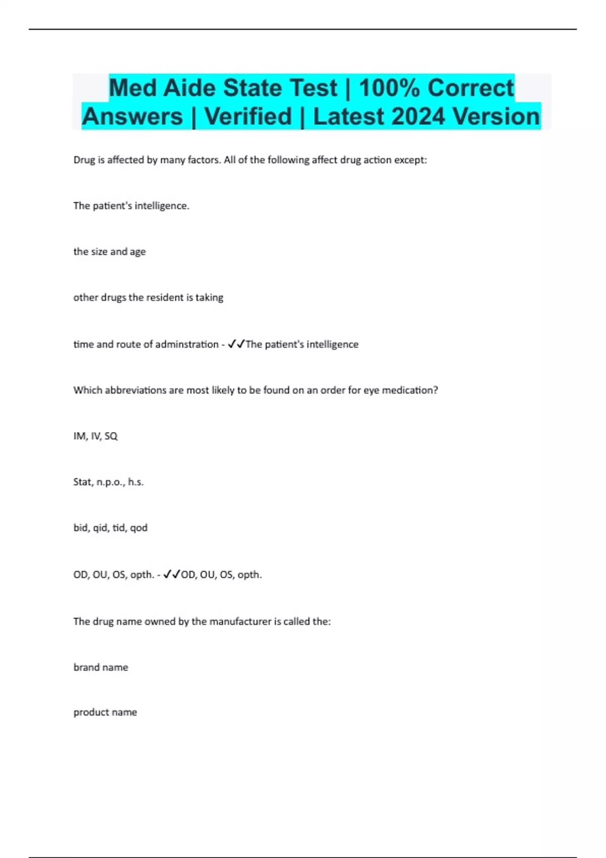 Med Aide State Test | 100% Correct Answers | Verified | Latest 2024 Version