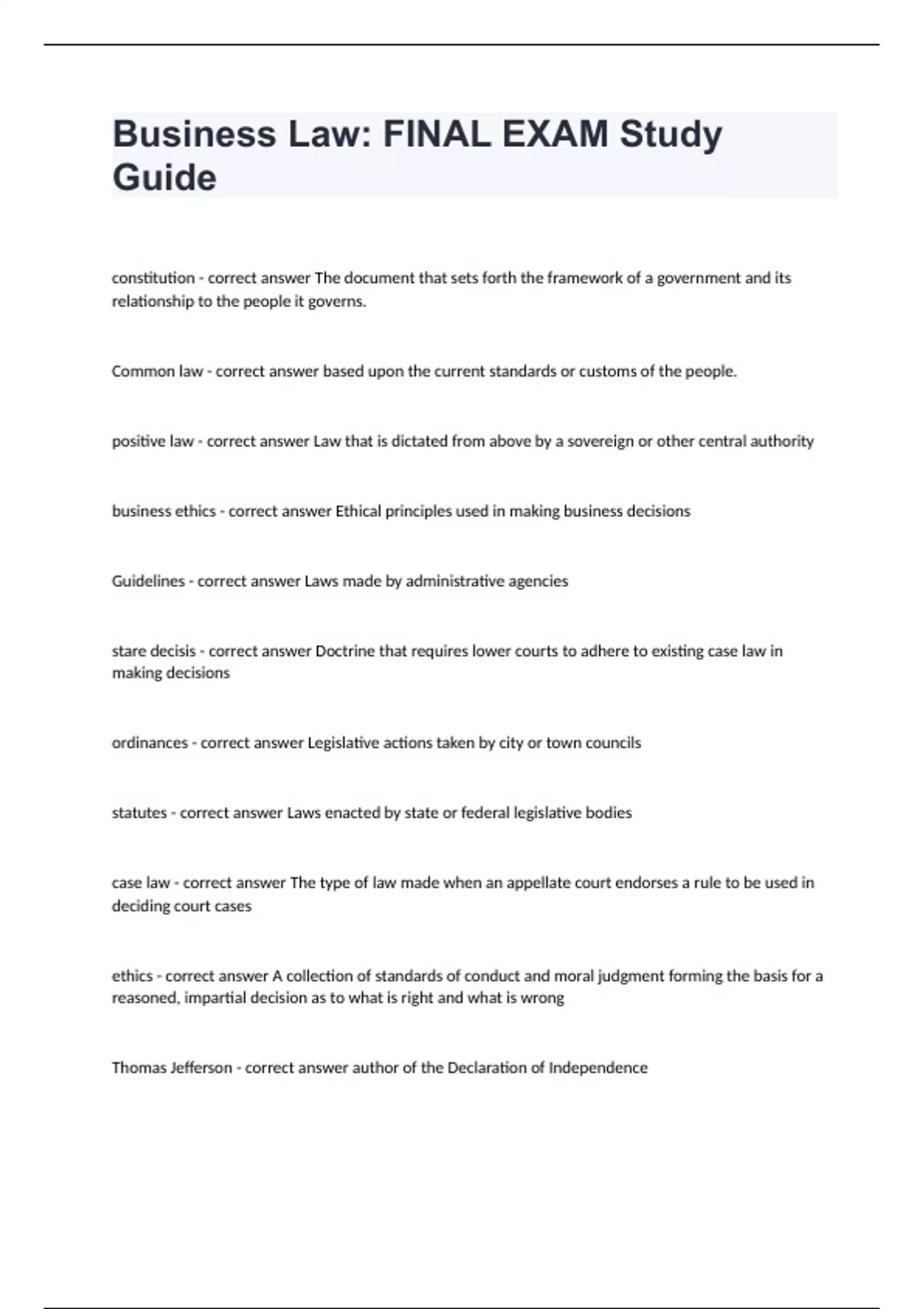 business law Collin College -Business Law: FINAL EXAM Study Guide correctly answeredconstitution - correct answer The document that sets forth the framework of a government and its relationship to the people it governs. Common law - correct answer based upon the current standards or customs of the people. positive law - correct answer Law that is dictated from above by a sovereign or other central authority business ethics - correct answer Ethical principles used in making business decisions Guidelines - correct answer Laws made by administrative agencies stare decisis - correct answer Doctrine that requires lower courts to adhere to existing case law in making decisions ordinances - correct answer Legislative actions taken by city or town councils statutes - correct answer Laws enacted by state or federal legislative bodies case law - correct answer The type of law made when an appellate court endorses a rule to be used in deciding court cases ethics - correct answer A collection of standards of conduct and moral judgment forming the basis for a reasoned, impartial decision as to what is right and what is wrong Thomas Jefferson - correct answer author of the Declaration of Independence