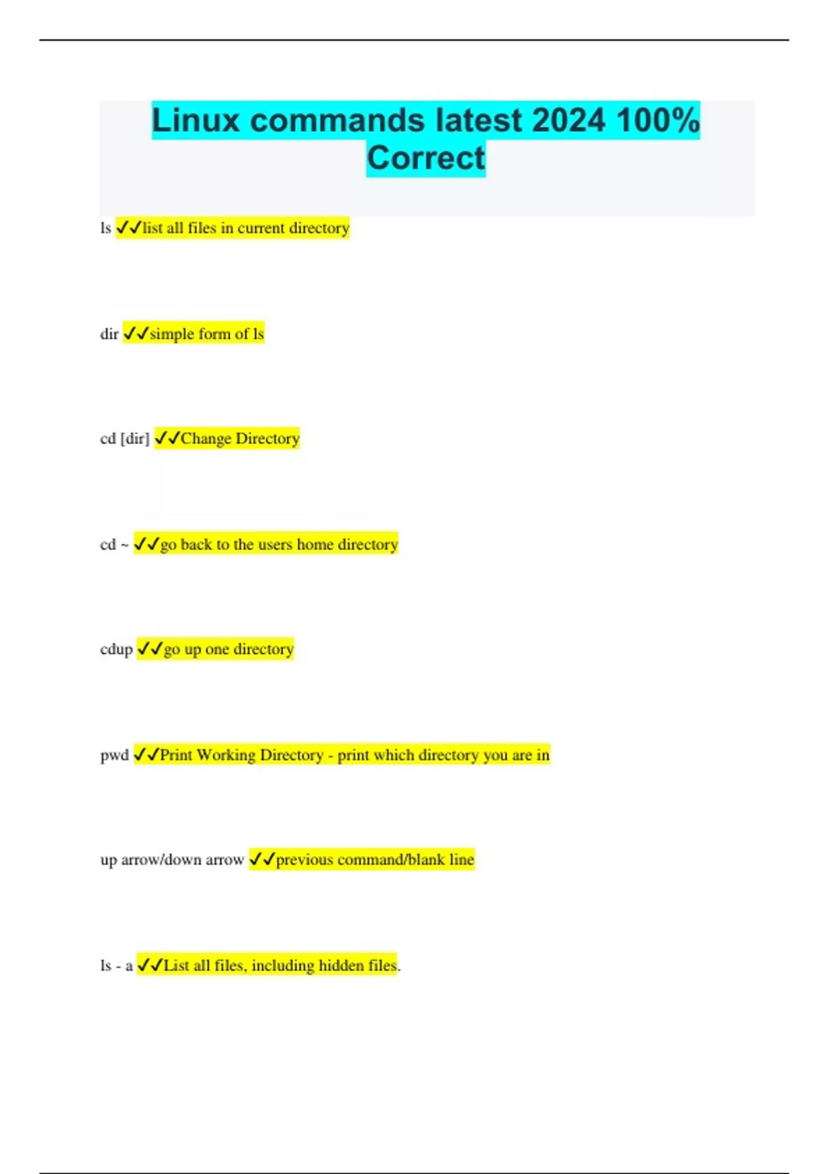 Linux commands latest 2024 100% Correct ls list all files in current directory dir simple form of ls cd [dir] Change Directory cd ~ go back to the users home directory cdup go up one directory pwd Print Working Directory - print which directory you are in up arrow/down arrow previous command/blank line ls - a List all files, including hidden files. ls /bin list all files in the /bin directory (or whichever directory) ls -l list all files in working directory in long format ls -l /etc /bin list all files in /etc and /bin in long format less display text file G [within less] go to end of text file 1G [within less] go to beginning of text file /characters [within less] search forward in text file for [characters] n [within less] repeat previous search h [within less] display complete list without commands and options q exit less file name_of_file will tell you what kind of file something is cp copy files or directories