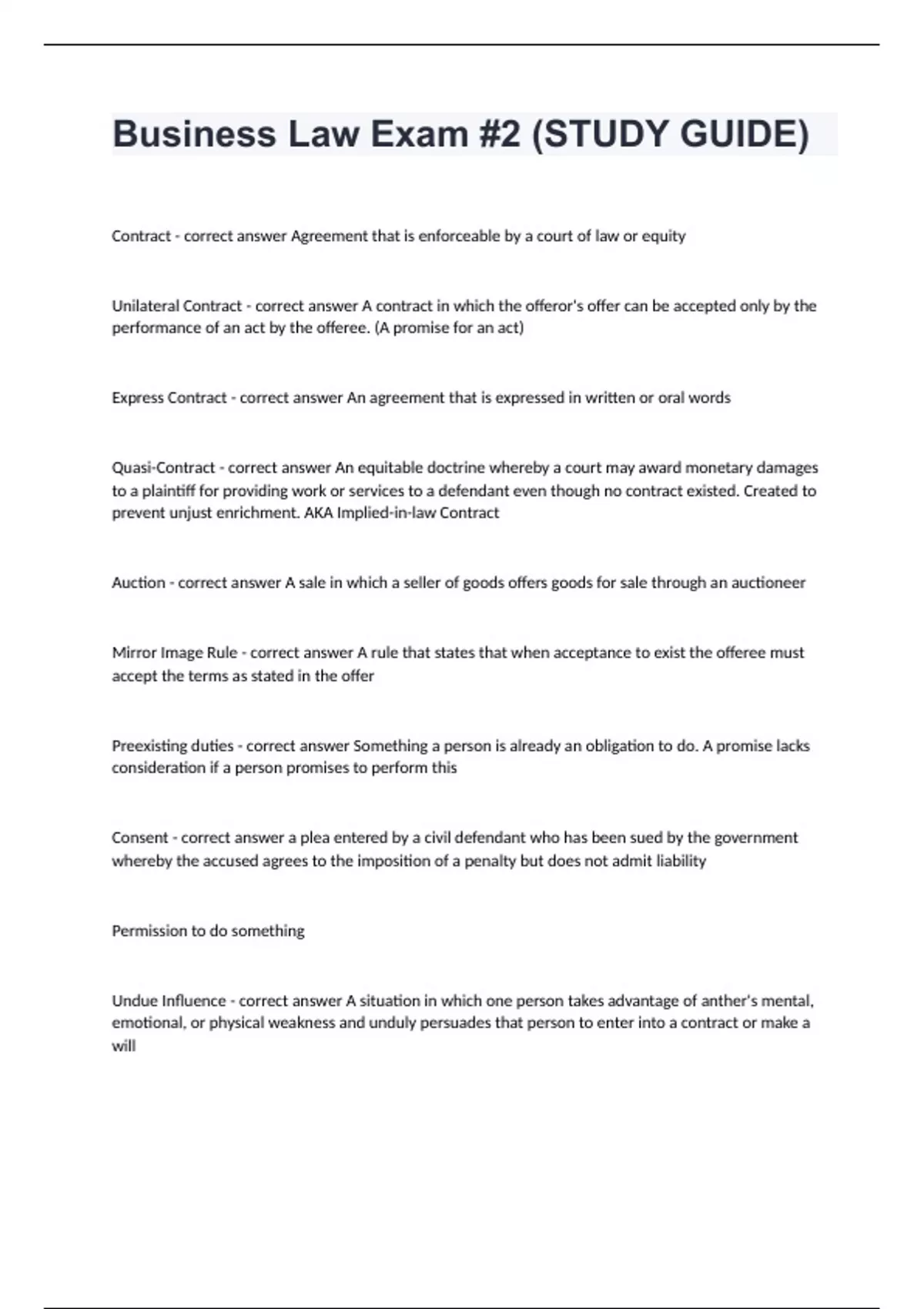 Business Law Exam #2 (STUDY GUIDE) with complete solutions rated A+Contract - correct answer Agreement that is enforceable by a court of law or equity Unilateral Contract - correct answer A contract in which the offeror's offer can be accepted only by the performance of an act by the offeree. (A promise for an act) Express Contract - correct answer An agreement that is expressed in written or oral words Quasi-Contract - correct answer An equitable doctrine whereby a court may award monetary damages to a plaintiff for providing work or services to a defendant even though no contract existed. Created to prevent unjust enrichment. AKA Implied-in-law Contract Auction - correct answer A sale in which a seller of goods offers goods for sale through an auctioneer Mirror Image Rule - correct answer A rule that states that when acceptance to exist the offeree must accept the terms as stated in the offer Preexisting duties - correct answer Something a person is already an obligation to do. A promise lacks consideration if a person promises to perform this Consent - correct answer a plea entered by a civil defendant who has been sued by the government whereby the accused agrees to the imposition of a penalty but does not admit liability Permission to do something Undue Influence - correct answer A situation in which one person takes advantage of anther's mental, emotional, or physical weakness and unduly persuades that person to enter into a contract or make a will