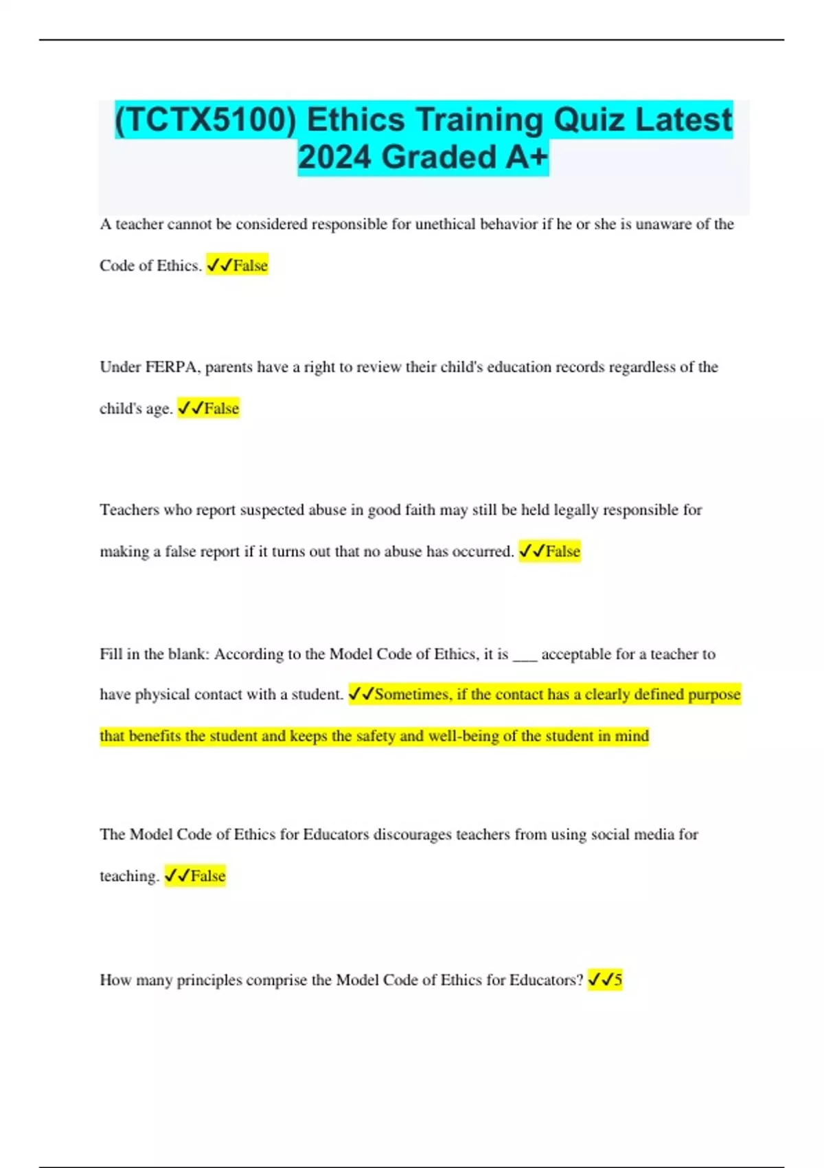 (TCTX5100) Ethics Training Quiz Latest 2024 Graded A+ A teacher cannot be considered responsible for unethical behavior if he or she is unaware of the Code of Ethics. False Under FERPA, parents have a right to review their child's education records regardless of the child's age. False Teachers who report suspected abuse in good faith may still be held legally responsible for making a false report if it turns out that no abuse has occurred. False Fill in the blank: According to the Model Code of Ethics, it is ___ acceptable for a teacher to have physical contact with a student. Sometimes, if the contact has a clearly defined purpose that benefits the student and keeps the safety and well-being of the student in mind The Model Code of Ethics for Educators discourages teachers from using social media for teaching. False How many principles comprise the Model Code of Ethics for Educators? 5 Schools may disclose students' names and grade point averages to the newspaper for a feature article about the district's top students, even if the students have not given their permission, because students know that valedictorian, salutatorian,