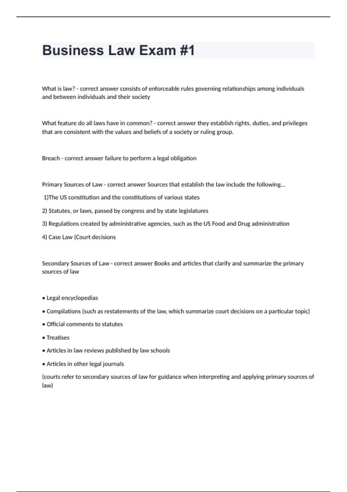 business law Collin College - What is law? - correct answer consists of enforceable rules governing relationships among individuals and between individuals and their society What feature do all laws have in common? - correct answer they establish rights, duties, and privileges that are consistent with the values and beliefs of a society or ruling group. Breach - correct answer failure to perform a legal obligation Primary Sources of Law - correct answer Sources that establish the law include the following... 1)The US constitution and the constitutions of various states 2) Statutes, or laws, passed by congress and by state legislatures 3) Regulations created by administrative agencies, such as the US Food and Drug administration 4) Case Law (Court decisions Secondary Sources of Law - correct answer Books and articles that clarify and summarize the primary sources of law • Legal encyclopedias • Compilations (such as restatements of the law, which summarize court decisions on a particular topic) • Official comments to statutes • Treatises • Articles in law reviews published by law schools • Articles in other legal journals (courts refer to secondary sources of law for guidance when interpreting and applying primary sources of law)