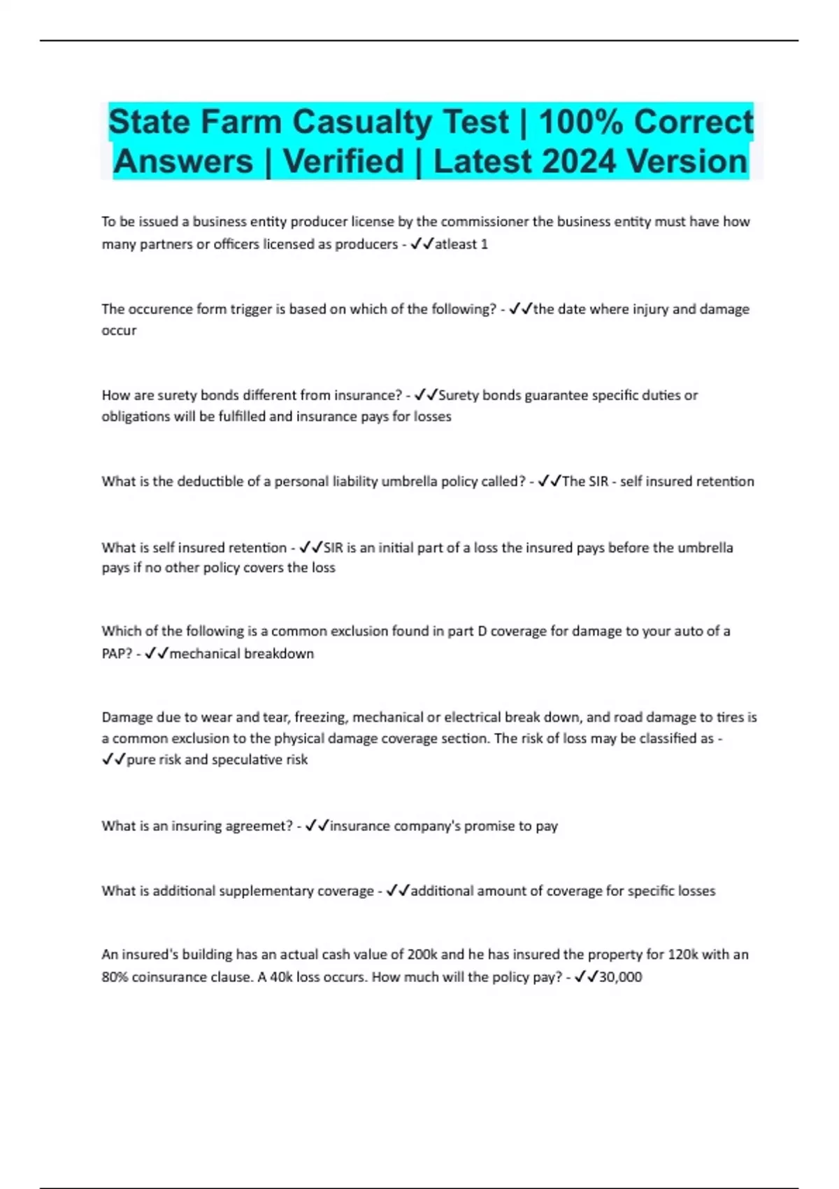 State Farm Casualty Test | 100% Correct Answers | Verified | Latest 2024 Version