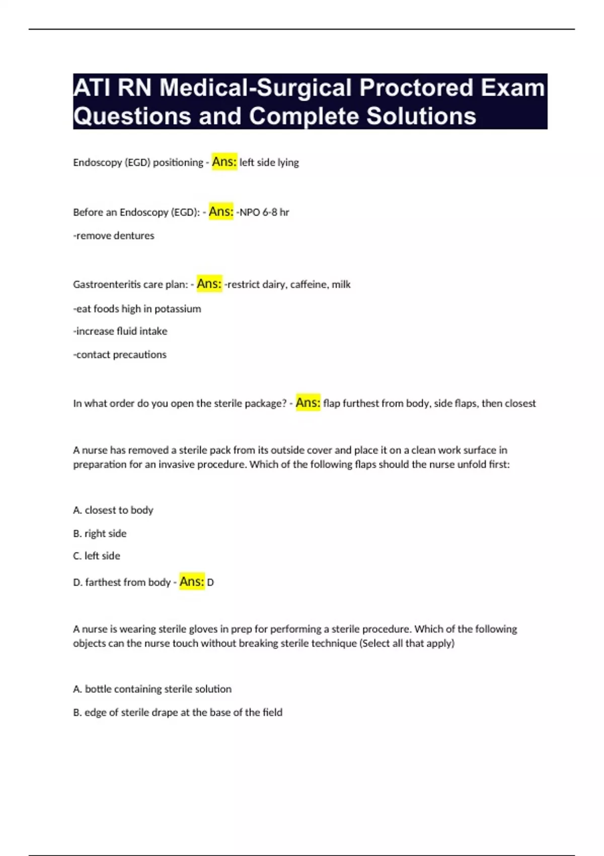 ATI RN Medical-Surgical Proctored Exam Questions and Complete Solutions Endoscopy (EGD) positioning - Ans: left side lying Before an Endoscopy (EGD): - Ans: -NPO 6-8 hr -remove dentures Gastroenteritis care plan: - Ans: -restrict dairy, caffeine, milk -eat foods high in potassium -increase fluid intake -contact precautions In what order do you open the sterile package? - Ans: flap furthest from body, side flaps, then closest A nurse has removed a sterile pack from its outside cover and place it on a clean work surface in preparation for an invasive procedure. Which of the following flaps should the nurse unfold first: A. closest to body B. right side C. left side D. farthest from body - Ans: D A nurse is wearing sterile gloves in prep for performing a sterile procedure. Which of the following objects can the nurse touch without breaking sterile technique (Select all that apply) A. bottle containing sterile solution B. edge of sterile drape at the base of the field C. inner wrapping of an item on the sterile field D. irrigation syringe on the sterile field E. one gloved hand with the other gloved hand - Ans: C, D, E A nurse has prepared a sterile field for assisting a provider with a chest tube insertion. Which of the following events should the nurse recognize as contaminating the field (Select all that apply) A. provider drops a sterile instrument onto the near side of the sterile field B. nurse moistens a cotton ball with sterile normal saline and places it on sterile field C. procedure is delayed 1hr because the provider receives an emergency call D. nurse turns to speak to someone who enters through the door behind the nurse E. clients hand brushes against the outer edge of the sterile field - Ans: B, C, D TB is suspected, what precautionary actions to do? - Ans: -negative airflow room, airborne precautions -nurses wear N95 mask, client wears if going out of the room -admin heat & humidified O2 therapy as prescribed TB interventions: - Ans: -family members should be screened -4 meds taken for 6-12 months -not contagious when they have 3 negative sputum cultures What to watch for when on Isoniazid: - Ans: numb/tingling in the hands & feet What to watch for when on Rifampin: - Ans: -orange secretions normal -watch for jaundice -interferes with birth control What to watch for when on Ethambutol: - Ans: vision changes Client teaching for genital herpes: - Ans: -can be transmitted with or w/out blisters -sexual partners should be informed & screened -no cure, just meds to help w/symptoms -abstain from intercourse until lesions are completely healed -gently clean areas w/mild soap & water Caring for a client following a stroke of the right side with left-sided hemipalegia: - Ans: -thicken liquids/foods -high fowlers -speech therapist for helping w/eating & speech -monitor gag reflex/swallowing abilities -have suction equipment available -occupational therapy -support left arm with pillows, slings, etc High sodium foods clients with HF & Pulmonary edema should avoid: - Ans: -cheese -soups -bread -cold cuts/cured meats -pizza -eggs & omelets -hot dogs -baked ham Which non-opioid drug decreases the effect of aspirin? - Ans: ibuprofen Ketorolac should not be used concurrently with... - Ans: other NSAIDS Glucocorticoids increase the risk of gastric bleeding when taken with... - Ans: non-opioid analgesics To access an implanted port, you must use a... - Ans: noncoring (Huber) needle When done accessing an implanted port... - Ans: flush with 10 mL 0.9% sodium chloride Therapeutic effects of furosemide (Lasix) - Ans: -decreases preload of the heart -decreases potassium levels -increases urine output -decrease BP -decrease edema Valsartan for HF expected outcomes/findings: - Ans: -vasodilation -excretion of sodium & water -reduces BP -reduces risk of mortality in post-MI pts left w/vent dysfunction Expected findings of meds that increase urinary output (diuretics): - Ans: -decreased potassium -weight loss -decrease in edema -decreased calcium -increased urine output -decreased BP -decrease in ICP & IOP Client teaching for Nitroglycerin: - Ans: 1. stop activity & rest 2. place nitro tab under tongue 3. if pain is unrelieved in 5 min, call 911 or go to ED 4. take 2 or more doses at 5 min intervals -headache is a common side effect of nitro Which foods should the client on Warfarin avoid? - Ans: dark leafy green veggies Client teaching for anticoagulant therapy: - Ans: -bleeding precautions -no added meds that increase bleeding -on it for 6-8 weeks prior to hematologic dx procedure -must have blood levels checked often -monitor vitamin K in their diet Expected prescriptions for Hypertension: - Ans: -furosemide (Lasix) -aldactone (potassium sparing diuretic) -hydrochlorothiazide (diuretic) -verapamil, dilitiazem (CCB) -captopril, lisinopril (ACE inhibitors) -losartan, telmisartan (ARBs) -eplerenone -atenolol, metoprolol (Beta blockers) -clonidine -prazosin (minipress) Contraindications for Nadolol: - Ans: -asthma -sinus bradycardia -cardiogenic shock -cardiac failure -diabetes -pregnancy -right side HF -emphysema -severe COPD Treatment for diabetes insipidus: - Ans: -daily weights -no caffeine or alcohol -desmopressin acetate/DDVAP -aqueous vasopressin/Pitressin -carbamazepine (tegretol) -high fiber diet Meds for DI, what to look out for/do: - Ans: -adjust based on urine output -daily weights -inform of weight gain of 2 lb in 24 hr -notify if headaches or confusion occur -monitor for infection -monitor for dizziness/drowsiness Protein requirement of an adult: _____g of protein per kg - Ans: 0.8 g Caring for a client who has pancreatitis: - Ans: -keep NPO -NG tube to suction gastric contents -low fat, high protein, high carb diet Risk factors: -high fat diet -excessive alcohol consumption -age Expected lab findings for a client with pancreatitis: - Ans: -increased amylase & lipase -increased WBC -decreased platelets -increased glucose -increased liver enzymes & bilirubin -elevated ESR -decreased calcium
