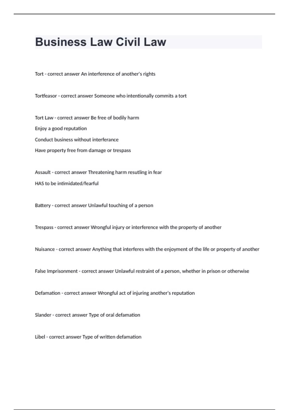 business law Collin College -Business Law Civil Law questions well answeredTort - correct answer An interference of another's rights Tortfeasor - correct answer Someone who intentionally commits a tort Tort Law - correct answer Be free of bodily harm Enjoy a good reputation Conduct business without interferance Have property free from damage or trespass Assault - correct answer Threatening harm resutling in fear HAS to be intimidated/fearful Battery - correct answer Unlawful touching of a person Trespass - correct answer Wrongful injury or interference with the property of another Nuisance - correct answer Anything that interferes with the enjoyment of the life or property of another False Imprisonment - correct answer Unlawful restraint of a person, whether in prison or otherwise Defamation - correct answer Wrongful act of injuring another's reputation Slander - correct answer Type of oral defamation Libel - correct answer Type of written defamation