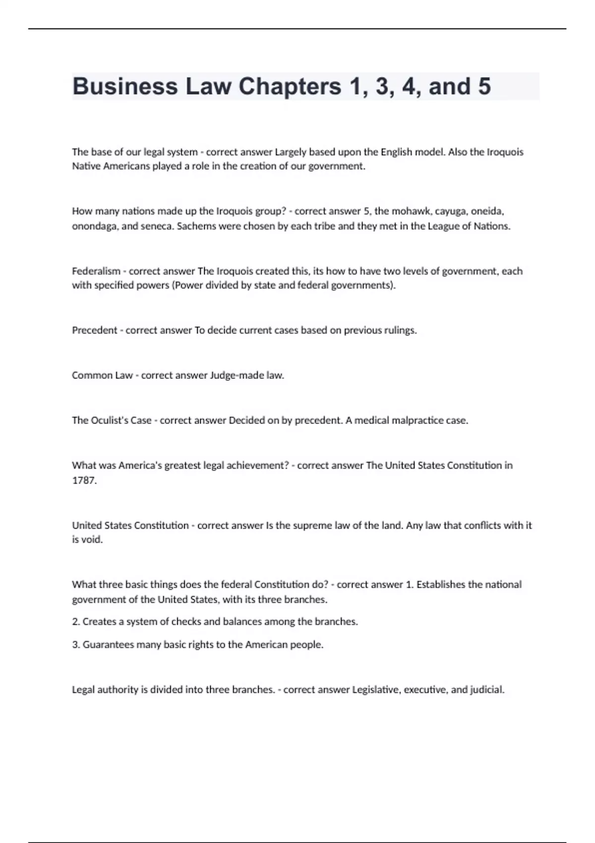 Business Law Chapters 1, 3, 4, and 5 fully solved graded A+The base of our legal system - correct answer Largely based upon the English model. Also the Iroquois Native Americans played a role in the creation of our government. How many nations made up the Iroquois group? - correct answer 5, the mohawk, cayuga, oneida, onondaga, and seneca. Sachems were chosen by each tribe and they met in the League of Nations. Federalism - correct answer The Iroquois created this, its how to have two levels of government, each with specified powers (Power divided by state and federal governments). Precedent - correct answer To decide current cases based on previous rulings. Common Law - correct answer Judge-made law. The Oculist's Case - correct answer Decided on by precedent. A medical malpractice case. What was America's greatest legal achievement? - correct answer The United States Constitution in 1787. United States Constitution - correct answer Is the supreme law of the land. Any law that conflicts with it is void. What three basic things does the federal Constitution do? - correct answer 1. Establishes the national government of the United States, with its three branches. 2. Creates a system of checks and balances among the branches. 3. Guarantees many basic rights to the American people. Legal authority is divided into three branches. - correct answer Legislative, executive, and judicial.