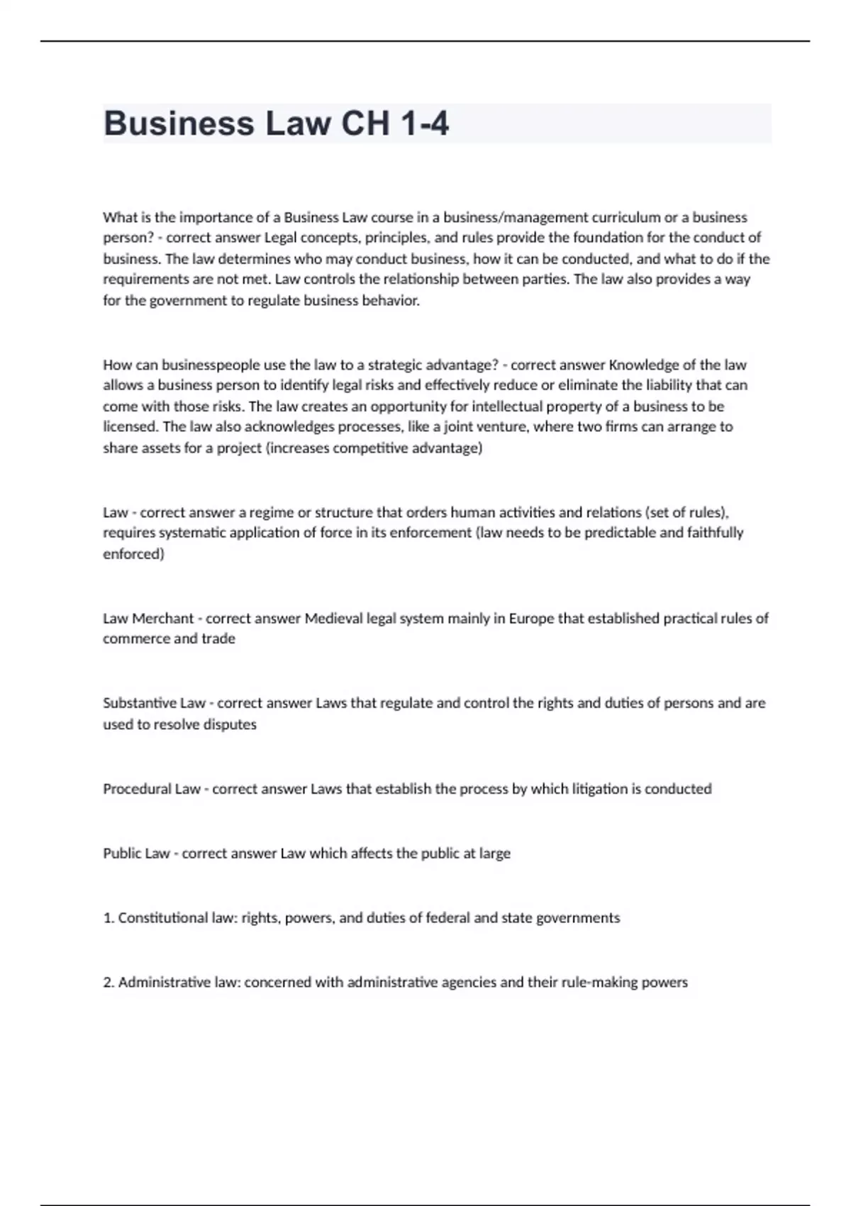 What is the importance of a Business Law course in a business/management curriculum or a business person? - correct answer Legal concepts, principles, and rules provide the foundation for the conduct of business. The law determines who may conduct business, how it can be conducted, and what to do if the requirements are not met. Law controls the relationship between parties. The law also provides a way for the government to regulate business behavior. How can businesspeople use the law to a strategic advantage? - correct answer Knowledge of the law allows a business person to identify legal risks and effectively reduce or eliminate the liability that can come with those risks. The law creates an opportunity for intellectual property of a business to be licensed. The law also acknowledges processes, like a joint venture, where two firms can arrange to share assets for a project (increases competitive advantage) Law - correct answer a regime or structure that orders human activities and relations (set of rules), requires systematic application of force in its enforcement (law needs to be predictable and faithfully enforced) Law Merchant - correct answer Medieval legal system mainly in Europe that established practical rules of commerce and trade Substantive Law - correct answer Laws that regulate and control the rights and duties of persons and are used to resolve disputes Procedural Law - correct answer Laws that establish the process by which litigation is conducted Public Law - correct answer Law which affects the public at large 1. Constitutional law: rights, powers, and duties of federal and state governments 2. Administrative law: concerned with administrative agencies and their rule-making powers