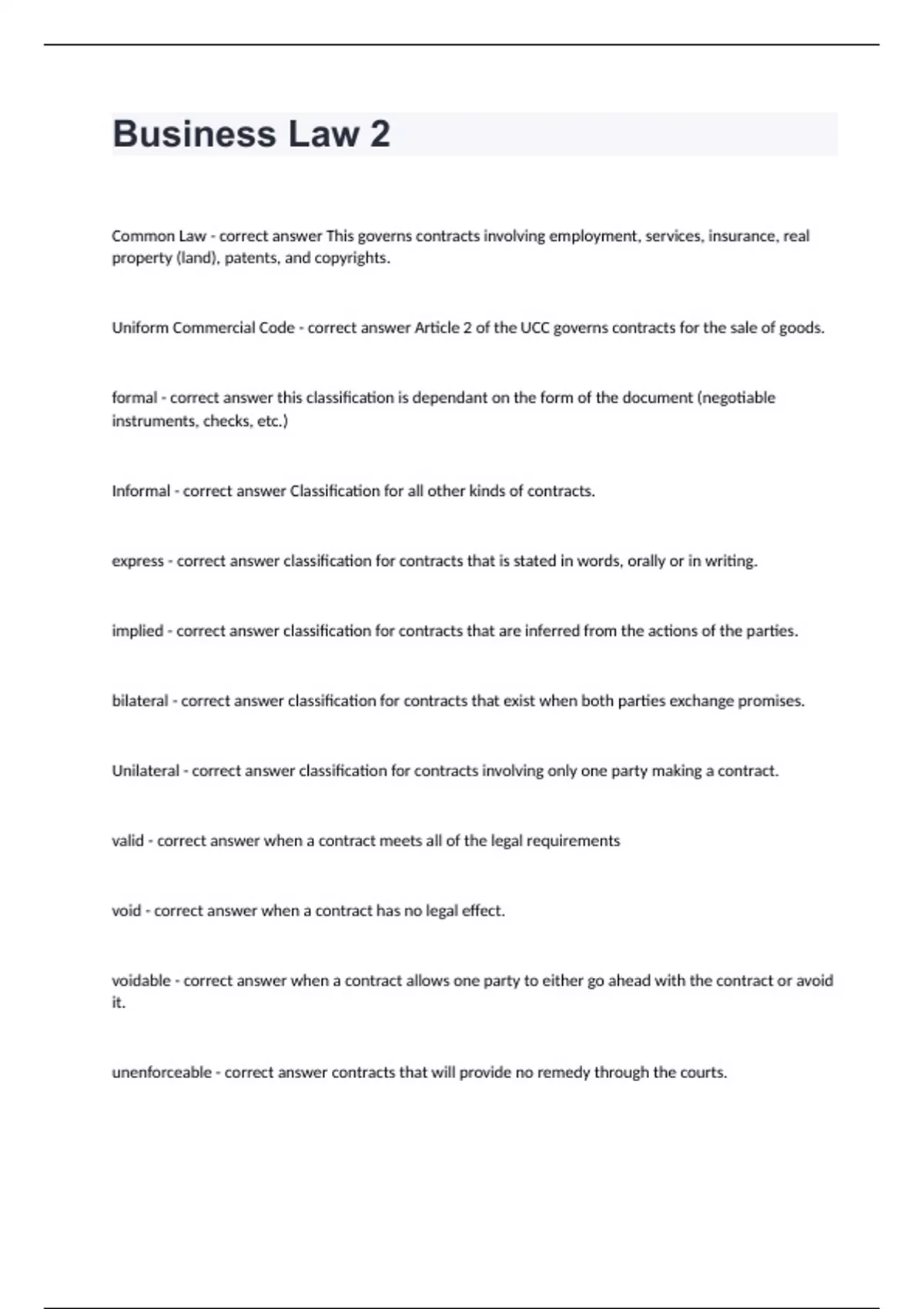 Business Law 2 with verified answers Common Law - correct answer This governs contracts involving employment, services, insurance, real property (land), patents, and copyrights. Uniform Commercial Code - correct answer Article 2 of the UCC governs contracts for the sale of goods. formal - correct answer this classification is dependant on the form of the document (negotiable instruments, checks, etc.) Informal - correct answer Classification for all other kinds of contracts. express - correct answer classification for contracts that is stated in words, orally or in writing. implied - correct answer classification for contracts that are inferred from the actions of the parties. bilateral - correct answer classification for contracts that exist when both parties exchange promises. Unilateral - correct answer classification for contracts involving only one party making a contract. valid - correct answer when a contract meets all of the legal requirements void - correct answer when a contract has no legal effect. voidable - correct answer when a contract allows one party to either go ahead with the contract or avoid it. unenforceable - correct answer contracts that will provide no remedy through the courts.