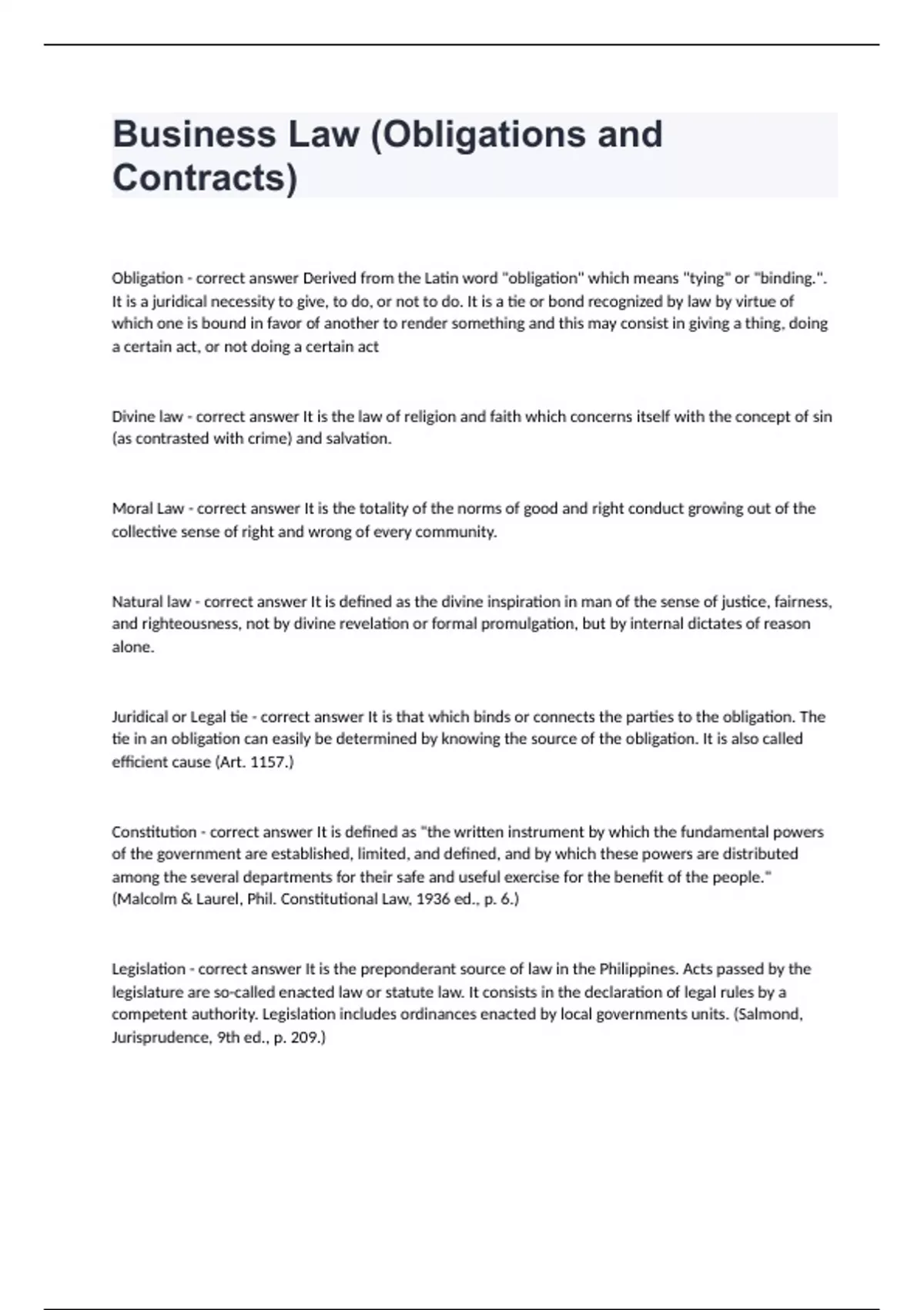 Business Law (Obligations and Contracts) fully solved graded A+Obligation - correct answer Derived from the Latin word "obligation" which means "tying" or "binding.". It is a juridical necessity to give, to do, or not to do. It is a tie or bond recognized by law by virtue of which one is bound in favor of another to render something and this may consist in giving a thing, doing a certain act, or not doing a certain act Divine law - correct answer It is the law of religion and faith which concerns itself with the concept of sin (as contrasted with crime) and salvation. Moral Law - correct answer It is the totality of the norms of good and right conduct growing out of the collective sense of right and wrong of every community. Natural law - correct answer It is defined as the divine inspiration in man of the sense of justice, fairness, and righteousness, not by divine revelation or formal promulgation, but by internal dictates of reason alone. Juridical or Legal tie - correct answer It is that which binds or connects the parties to the obligation. The tie in an obligation can easily be determined by knowing the source of the obligation. It is also called efficient cause (Art. 1157.) Constitution - correct answer It is defined as "the written instrument by which the fundamental powers of the government are established, limited, and defined, and by which these powers are distributed among the several departments for their safe and useful exercise for the benefit of the people." (Malcolm & Laurel, Phil. Constitutional Law, 1936 ed., p. 6.) Legislation - correct answer It is the preponderant source of law in the Philippines. Acts passed by the legislature are so-called enacted law or statute law. It consists in the declaration of legal rules by a competent authority. Legislation includes ordinances enacted by local governments units. (Salmond, Jurisprudence, 9th ed., p. 209.) Administrative or executive orders, regulations, and rulings - correct answer They are those issued by administrative officials under legislative authority. Administrative rules and regulations are intended to clarify or explain the law and carry into effect its general provisions. . Administrative acts are valid only when they are not contrary to the laws and Constitution. (Art. 7, Civil Code.)