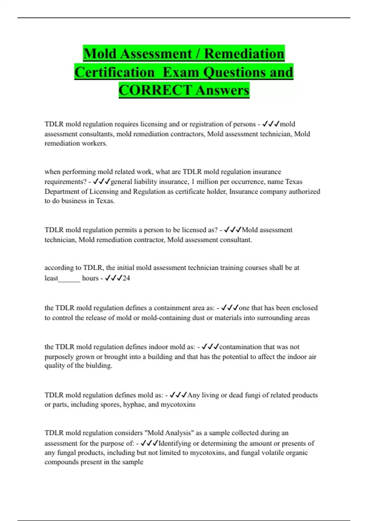 Mold Assessment / Remediation Certification Exam Questions and CORRECT Answers