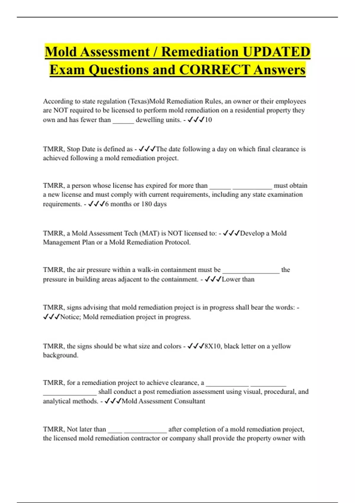 According to state regulation (Texas)Mold Remediation Rules, an owner or their employees are NOT required to be licensed to perform mold remediation on a residential property they own and has fewer than ______ dewelling units. - 10 TMRR, Stop Date is defined as - The date following a day on which final clearance is achieved following a mold remediation project. TMRR, a person whose license has expired for more than ______ ___________ must obtain a new license and must comply with current requirements, including any state examination requirements. - 6 months or 180 days TMRR, a Mold Assessment Tech (MAT) is NOT licensed to: - Develop a Mold Management Plan or a Mold Remediation Protocol.