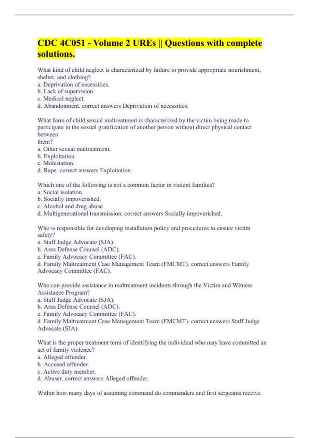 What kind of child neglect is characterized by failure to provide appropriate nourishment, shelter, and clothing? a. Deprivation of necessities. b. Lack of supervision. c. Medical neglect. d. Abandonment. correct answers Deprivation of necessities. What form of child sexual maltreatment is characterized by the victim being made to participate in the sexual gratification of another person without direct physical contact between them? a. Other sexual maltreatment. b. Exploitation. c. Molestation. d. Rape. correct answers Exploitation. Which one of the following is not a common factor in violent families? a. Social isolation. b. Socially impoverished. c. Alcohol and drug abuse. d. Multigenerational transmission. correct answers Socially impoverished. Who is responsible for developing installation policy and procedures to ensure victim safety? a. Staff Judge Advocate (SJA). b. Area Defense Counsel (ADC). c. Family Advocacy Committee (FAC). d. Family Maltreatment Case Management Team (FMCMT). correct answers Family Advocacy Committee (FAC). Who can provide assistance in maltreatment incidents through the Victim and Witness Assistance Program? a. Staff Judge Advocate (SJA). b. Area Defense Counsel (ADC). c. Family Advocacy Committee (FAC). d. Family Maltreatment Case Management Team (FMCMT). correct answers Staff Judge Advocate (SJA). What is the proper treatment term of identifying the individual who may have committed an act of family violence? a. Alleged offender. b. Accused offender. c. Active duty member. d. Abuser. correct answers Alleged offender. Within how many days of assuming command do commanders and first sergeants receive