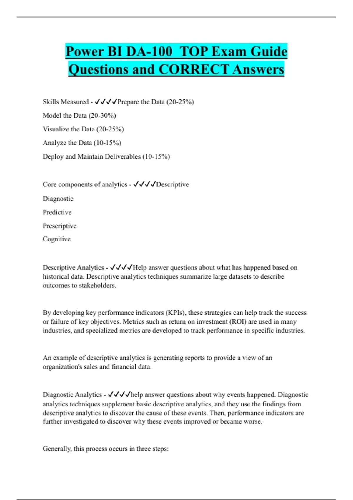 Skills Measured - Prepare the Data (20-25%) Model the Data (20-30%) Visualize the Data (20-25%) Analyze the Data (10-15%) Deploy and Maintain Deliverables (10-15%) Core components of analytics - Descriptive Diagnostic Predictive Prescriptive Cognitive Descriptive Analytics - Help answer questions about what has happened based on historical data. Descriptive analytics techniques summarize large datasets to describe outcomes to stakeholders.