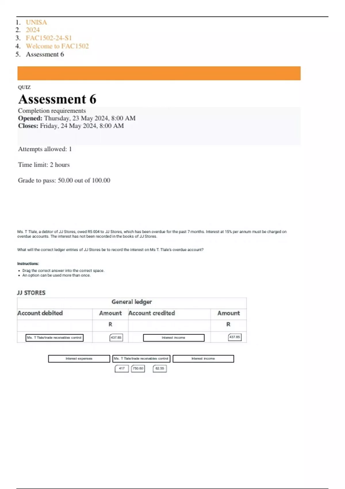Ms. T Tlale, a debtor of JJ Stores, owed R5 004 to JJ Stores, which has been overdue for the past 7 months. Interest at 15% per annum must be charged on