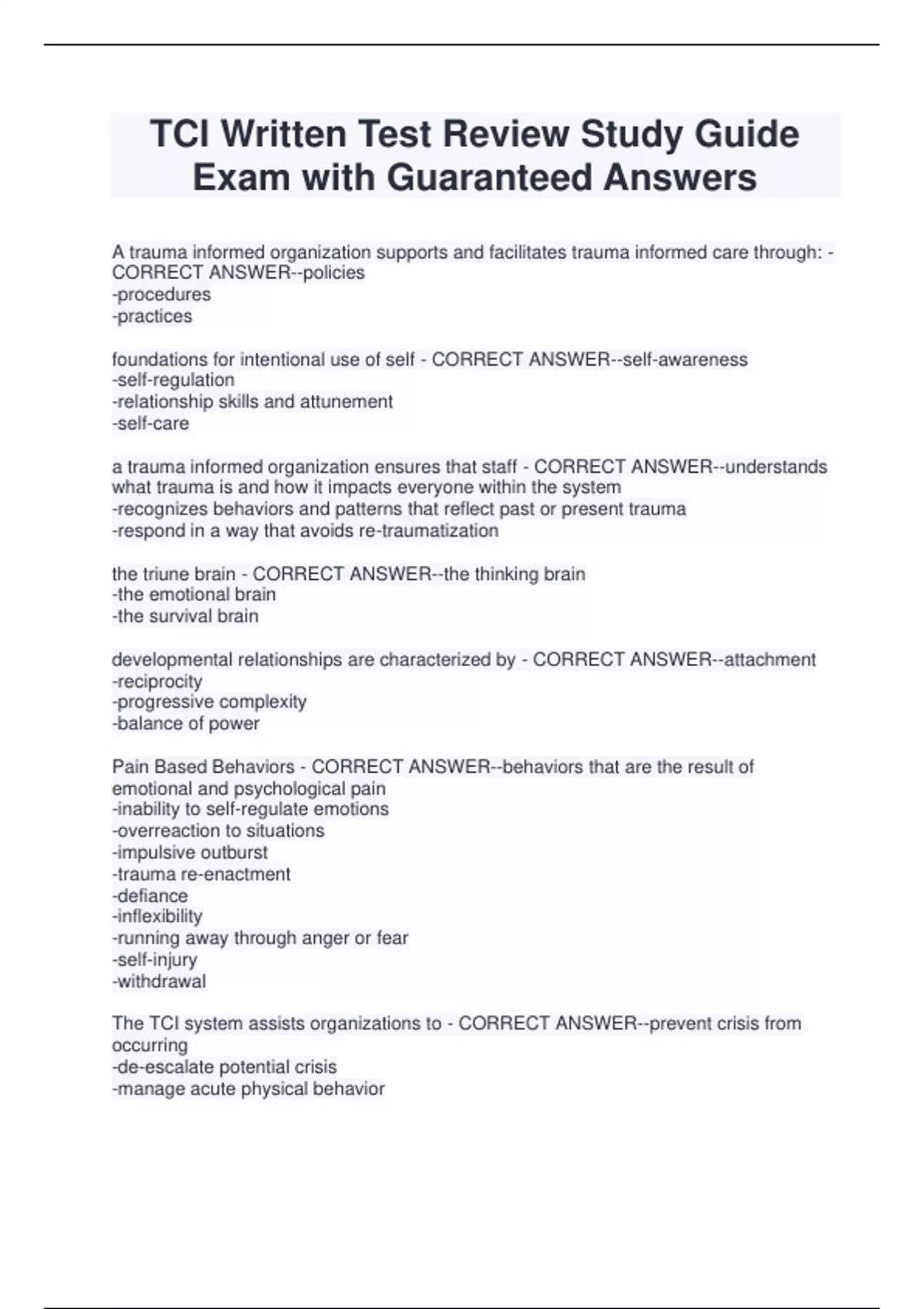 TCI Written Test Review Study Guide Exam with Guaranteed Answers A trauma informed organization supports and facilitates trauma informed care through: - CORRECT ANSWER--policies -procedures -practices foundations for intentional use of self - CORRECT ANSWER--self-awareness -self-regulation -relationship skills and attunement -self-care a trauma informed organization ensures that staff - CORRECT ANSWER--understands what trauma is and how it impacts everyone within the system -recognizes behaviors and patterns that reflect past or present trauma -respond in a way that avoids re-traumatization the triune brain - CORRECT ANSWER--the thinking brain -the emotional brain -the survival brain developmental relationships are characterized by - CORRECT ANSWER--attachment -reciprocity -progressive complexity -balance of power Pain Based Behaviors - CORRECT ANSWER--behaviors that are the result of emotional and psychological pain -inability to self-regulate emotions -overreaction to situations -impulsive outburst -trauma re-enactment -defiance -inflexibility -running away through anger or fear -self-injury -withdrawal The TCI system assists organizations to - CORRECT ANSWER--prevent crisis from occurring -de-escalate potential crisis -manage acute physical behavior -reduce potential and actual injury to children and staff -teach children emotional regulation skills and coping strategies -develop a learning organization a crisis occurs when - CORRECT ANSWER-A child's fight, flight or freeze response is activated and they are unable to regulate their emotions and behaviors Therapeutic Milieu - CORRECT ANSWER-The combination of people, emotions, attitudes, and objects that create a sense of safety, respect, belonging, care, and accountability. Goals of Crisis Intervention - CORRECT ANSWER--support: providing immediate emotional and environmental support to reduce stress and risk and increase the child's sense of safety -teach: help children learn and practice ways to regulate their emotions and behaviors Spaces within the therapeutic milieu - CORRECT ANSWER-Ideological, Physical, Cultural, Social, Emotional stress model of crisis - CORRECT ANSWER-Baseline Triggering event, Escalation phase, Outburst crisis, Recovery. setting conditions - CORRECT ANSWER-Anything that makes challenging behavior or traumatic stress responses more or less likely to occur Four questions we ask ourselves in a crisis situation - CORRECT ANSWER-1. what am I feeling right now? 2. what does this child need, feel, expect, or want? 3. how is the environment affecting the situation