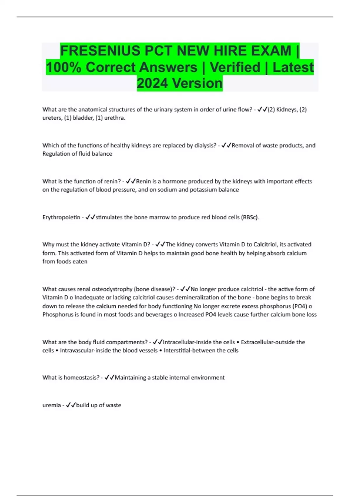 FRESENIUS PCT NEW HIRE EXAM | 100% Correct Answers | Verified | Latest 2024 Version