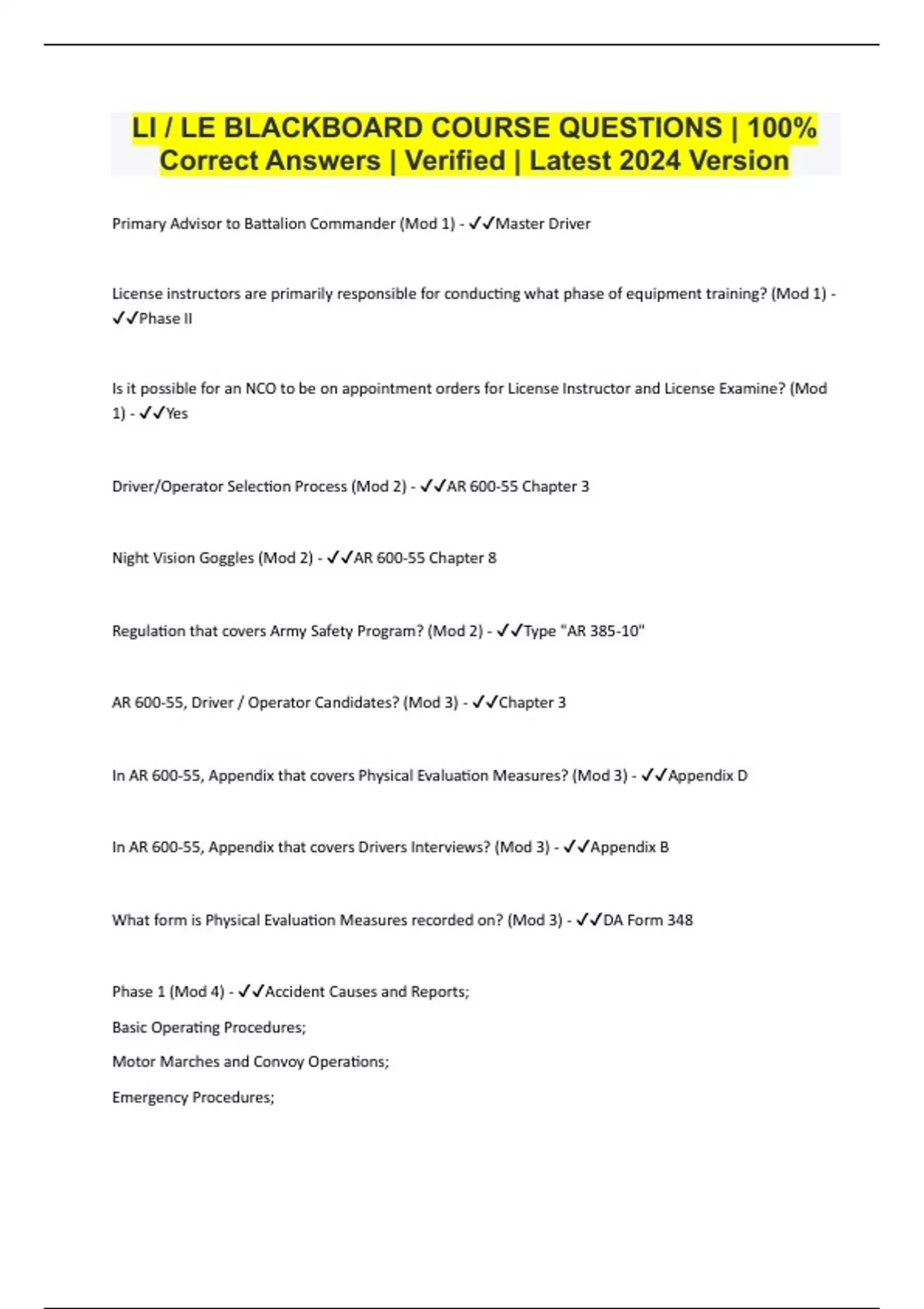 Primary Advisor to Battalion Commander (Mod 1) - Master Driver License instructors are primarily responsible for conducting what phase of equipment training? (Mod 1) - Phase II Is it possible for an NCO to be on appointment orders for License Instructor and License Examine? (Mod 1) - Yes Driver/Operator Selection Process (Mod 2) - AR 600-55 Chapter 3 Night Vision Goggles (Mod 2) - AR 600-55 Chapter 8 Regulation that covers Army Safety Program? (Mod 2) - Type "AR 385-10" AR 600-55, Driver / Operator Candidates? (Mod 3) - Chapter 3 In AR 600-55, Appendix that covers Physical Evaluation Measures? (Mod 3) - Appendix D In AR 600-55, Appendix that covers Drivers Interviews? (Mod 3) - Appendix B What form is Physical Evaluation Measures recorded on? (Mod 3)