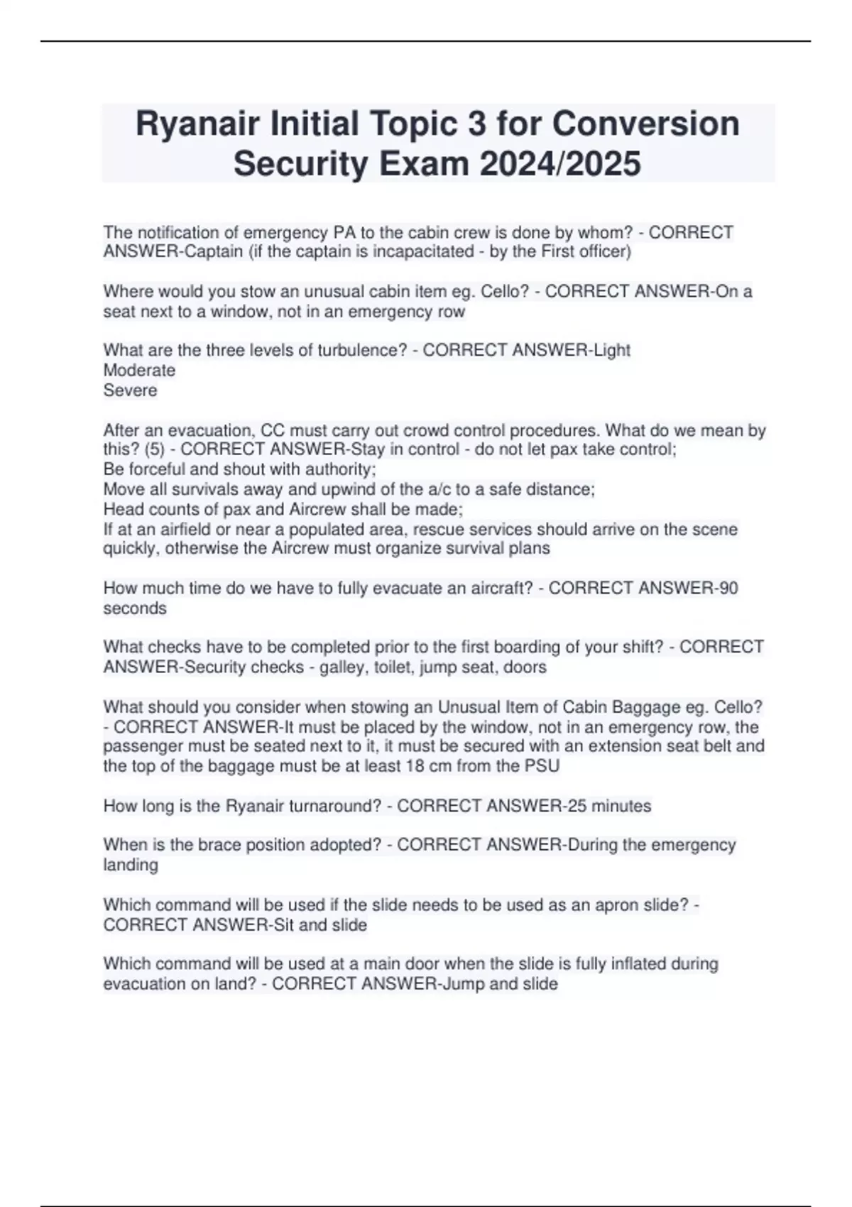 Ryanair Initial Topic 3 for Conversion Security Exam 2024/2025 The notification of emergency PA to the cabin crew is done by whom? - CORRECT ANSWER-Captain (if the captain is incapacitated - by the First officer) Where would you stow an unusual cabin item eg. Cello? - CORRECT ANSWER-On a seat next to a window, not in an emergency row What are the three levels of turbulence? - CORRECT ANSWER-Light Moderate Severe After an evacuation, CC must carry out crowd control procedures. What do we mean by this? (5) - CORRECT ANSWER-Stay in control - do not let pax take control; Be forceful and shout with authority; Move all survivals away and upwind of the a/c to a safe distance; Head counts of pax and Aircrew shall be made; If at an airfield or near a populated area, rescue services should arrive on the scene quickly, otherwise the Aircrew must organize survival plans How much time do we have to fully evacuate an aircraft? - CORRECT ANSWER-90 seconds What checks have to be completed prior to the first boarding of your shift? - CORRECT ANSWER-Security checks - galley, toilet, jump seat, doors What should you consider when stowing an Unusual Item of Cabin Baggage eg. Cello? - CORRECT ANSWER-It must be placed by the window, not in an emergency row, the passenger must be seated next to it, it must be secured with an extension seat belt and the top of the baggage must be at least 18 cm from the PSU How long is the Ryanair turnaround? - CORRECT ANSWER-25 minutes When is the brace position adopted? - CORRECT ANSWER-During the emergency landing Which command will be used if the slide needs to be used as an apron slide? - CORRECT ANSWER-Sit and slide Which command will be used at a main door when the slide is fully inflated during evacuation on land? - CORRECT ANSWER-Jump and slide