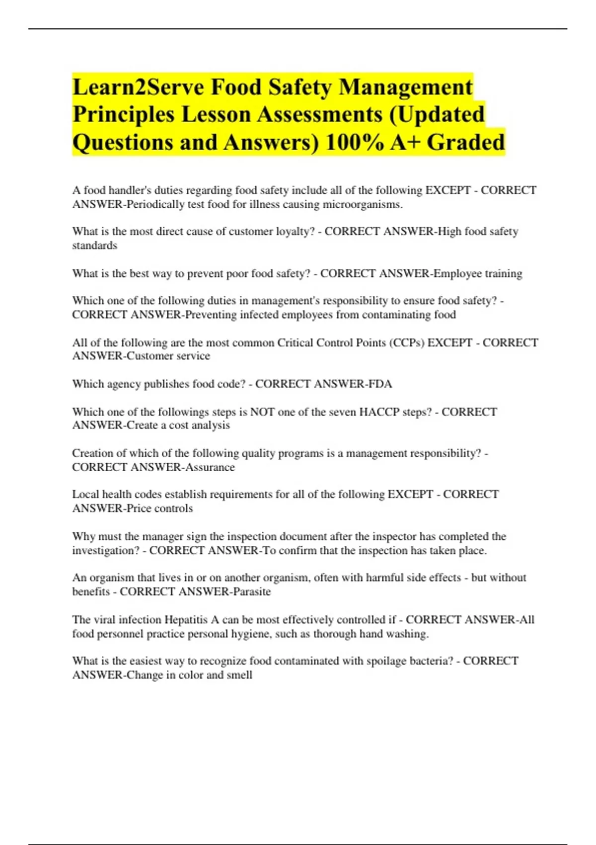 Learn2Serve Food Safety Management Principles Lesson Assessments (Updated Questions and Answers) 100% A+ Graded A food handler's duties regarding food safety include all of the following EXCEPT - CORRECT ANSWER-Periodically test food for illness causing microorganisms. What is the most direct cause of customer loyalty? - CORRECT ANSWER-High food safety standards What is the best way to prevent poor food safety? - CORRECT ANSWER-Employee training Which one of the following duties in management's responsibility to ensure food safety? - CORRECT ANSWER-Preventing infected employees from contaminating food All of the following are the most common Critical Control Points (CCPs) EXCEPT - CORRECT ANSWER-Customer service Which agency publishes food code? - CORRECT ANSWER-FDA Which one of the followings steps is NOT one of the seven HACCP steps? - CORRECT ANSWER-Create a cost analysis Creation of which of the following quality programs is a management responsibility? - CORRECT ANSWER-Assurance Local health codes establish requirements for all of the following EXCEPT - CORRECT ANSWER-Price controls Why must the manager sign the inspection document after the inspector has completed the investigation? - CORRECT ANSWER-To confirm that the inspection has taken place. An organism that lives in or on another organism, often with harmful side effects - but without benefits - CORRECT ANSWER-Parasite The viral infection Hepatitis A can be most effectively controlled if - CORRECT ANSWER-All food personnel practice personal hygiene, such as thorough hand washing. What is the easiest way to recognize food contaminated with spoilage bacteria? - CORRECT ANSWER-Change in color and smell Which one of the following situations would most likely promote bacterial contamination? - CORRECT ANSWER-Touching raw chicken and then cooked chicken without changing gloves. One of the most important reasons for using only reliable water sources is to reduce - CORRECT ANSWER-The number of parasites, such as Cyclospora Cayetanesis, that can infests foods. Which bacteria cause the greatest harm in the food industry? - CORRECT ANSWER-Pathogenic All of the following bacteria can cause food borne illness EXCEPT - CORRECT ANSWER-Acidophilus Milk Which of the following food contaminations would be suspected if the end of a can of tomatoes had begun to swell? - CORRECT ANSWER-Botulism Which one of the following food contaminations is usually associated with undercooked chicken? - CORRECT ANSWER-Salmonella Which of the following food contaminations is best prevented by cooking to safe temperatures? - CORRECT ANSWER-E. Coli Contamination of food items by other living organisms is known as - CORRECT ANSWER-Biological contamination Because they are living organisms, which one of the following methods would be both effective and safe to help reduce biological contaminations. - CORRECT ANSWER-Heat Perhaps the most common vehicle of contamination in the food industry is - CORRECT ANSWER-Hands, and so should be washed often. The contamination that results from the spread of bacteria from meat to vegetables is called - CORRECT ANSWER-Cross Which one of the following contaminates is a physical contamination? - CORRECT ANSWER-Hair You notice a food handler trim excess fat from a T-bone steak and then move towards a bowl of potatoes to begin peeling them with the same knife. - CORRECT ANSWER-Caution the food handler that she must clean and sanitize the knife. An employee brings you a bag of oatmeal in which he has found black specks. What is the most likely cause of those specks? - CORRECT ANSWER-Pests have gotten into the bag and left waste secretions in the oatmeal. Checking the dining areas of an eating establishment for the evidence of flaking paint, broken light bulbs, and wood damage will reduce the changes of what? - CORRECT ANSWER-Physical contimation
