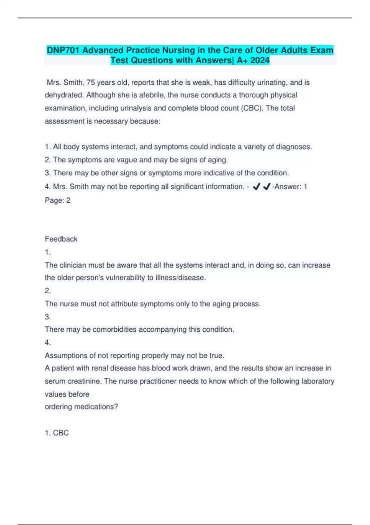 DNP701 Advanced Practice Nursing in the Care of Older Adults Exam Test Questions with Answers| A+ 2024 Mrs. Smith, 75 years old, reports that she is weak, has difficulty urinating, and is dehydrated. Although she is afebrile, the nurse conducts a thorough physical examination, including urinalysis and complete blood count (CBC). The total assessment is necessary because: 1. All body systems interact, and symptoms could indicate a variety of diagnoses. 2. The symptoms are vague and may be signs of aging. 3. There may be other signs or symptoms more indicative of the condition. 4. Mrs. Smith may not be reporting all significant information. - ️️ -Answer: 1 Page: 2 Feedback 1. The clinician must be aware that all the systems interact and, in doing so, can increase the older person's vulnerability to illness/disease. 2. The nurse must not attribute symptoms only to the aging process. 3. There may be comorbidities accompanying this condition. 4. Assumptions of not reporting properly may not be true. A patient with renal disease has blood work drawn, and the results show an increase in serum creatinine. The nurse practitioner needs to know which of the following laboratory values before ordering medications? 1. CBC 2. Culture and sensitivity of the urine 3. Creatinine clearance 4. Uric acid levels - ️️ -Answ