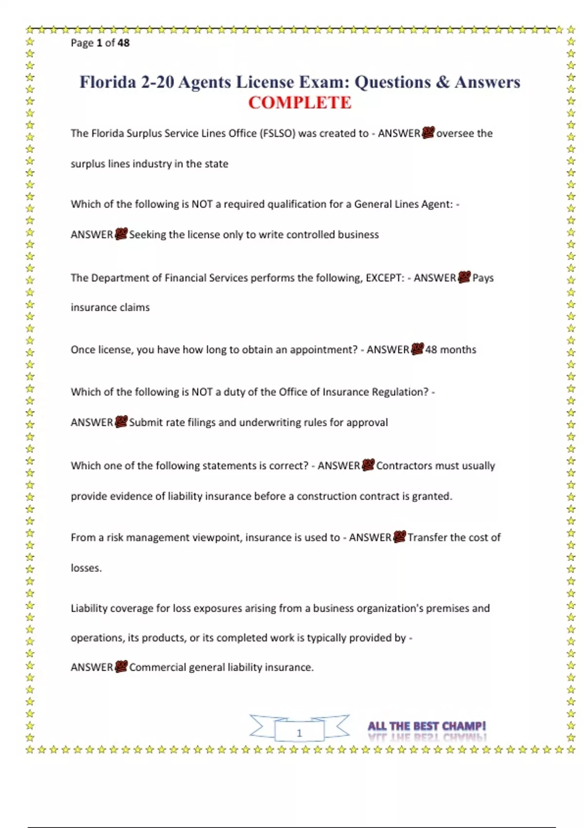 Florida 2-20 Agents License Exam Questions & Answers COMPLETE