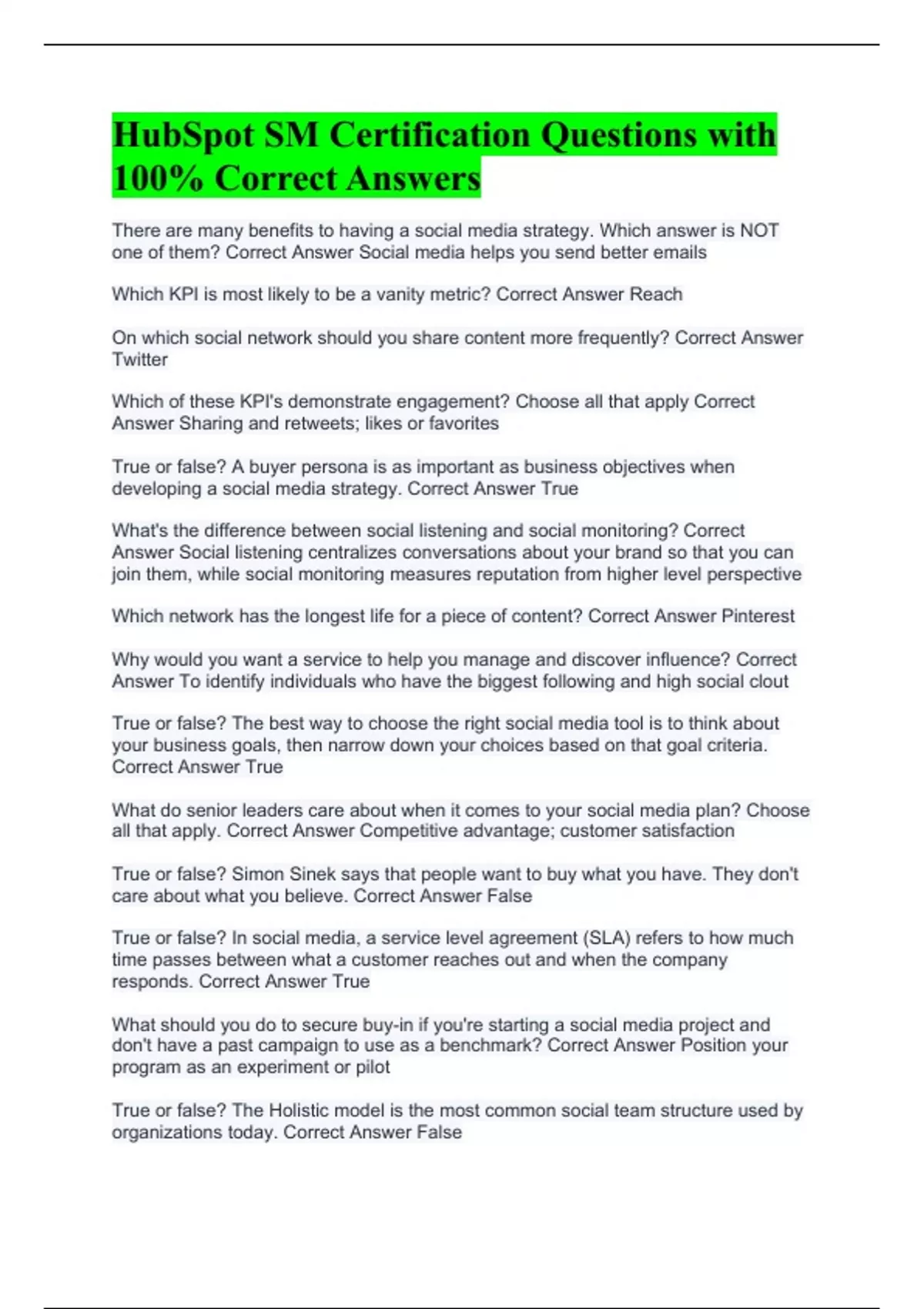 HubSpot SM Certification Questions with 100% Correct Answers