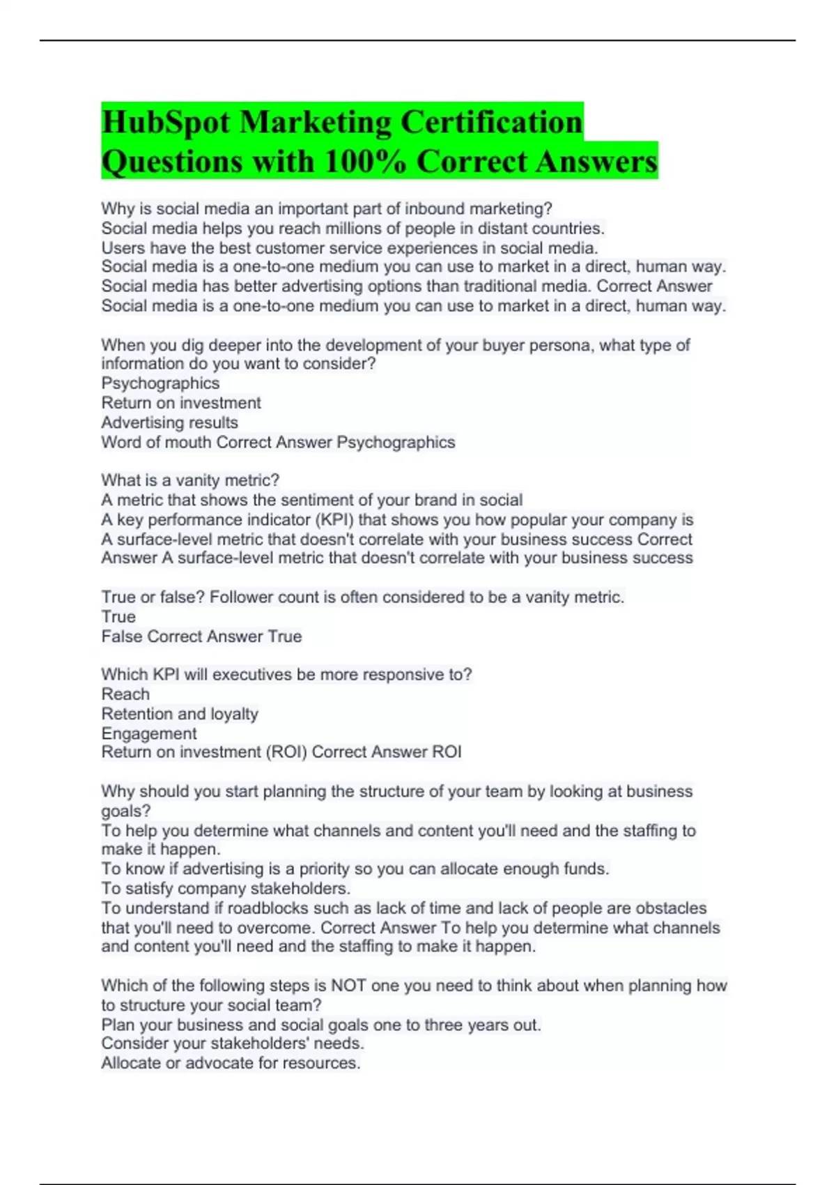HubSpot Marketing Certification Questions with 100% Correct Answers