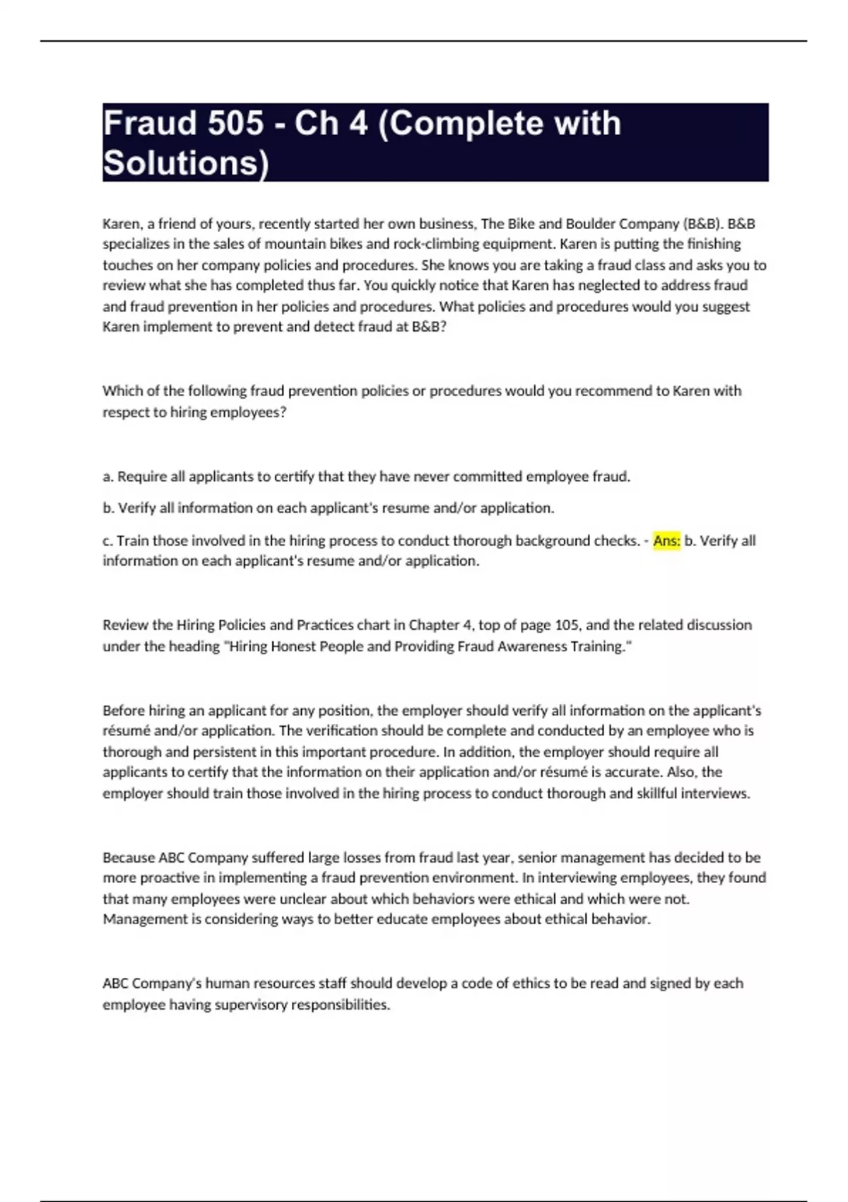 Fraud 505 - Ch 4 (Complete with Solutions) Karen, a friend of yours, recently started her own business, The Bike and Boulder Company (B&B). B&B specializes in the sales of mountain bikes and rock-climbing equipment. Karen is putting the finishing touches on her company policies and procedures. She knows you are taking a fraud class and asks you to review what she has completed thus far. You quickly notice that Karen has neglected to address fraud and fraud prevention in her policies and procedures. What policies and procedures would you suggest Karen implement to prevent and detect fraud at B&B? Which of the following fraud prevention policies or procedures would you recommend to Karen with respect to hiring employees? a. Require all applicants to certify that they have never committed employee fraud. b. Verify all information on each applicant's resume and/or application. c. Train those involved in the hiring process to conduct thorough background checks. - Ans: b. Verify all information on each applicant's resume and/or application. Review the Hiring Policies and Practices chart in Chapter 4, top of page 105, and the related discussion under the heading "Hiring Honest People and Providing Fraud Awareness Training." Before hiring an applicant for any position, the employer should verify all information on the applicant's résumé and/or application. The verification should be complete and conducted by an employee who is thorough and persistent in this important procedure. In addition, the employer should require all applicants to certify that the information on their application and/or résumé is accurate. Also, the employer should train those involved in the hiring process to conduct thorough and skillful interviews. Because ABC Company suffered large losses from fraud last year, senior management has decided to be more proactive in implementing a fraud prevention environment. In interviewing employees, they found that many employees were unclear about which behaviors were ethical and which were not. Management is considering ways to better educate employees about ethical behavior. ABC Company's human resources staff should develop a code of ethics to be read and signed by each employee having supervisory responsibilities. a. True b. False - Ans: False Senior management should develop a code of ethics or conduct and communicate it throughout the company. Every employee should be required to read and sign the code each year. Nellie works for a large manufacturing company. She heads the information systems department and works closely with the accounting department. Nellie knows a lot about the company's database systems and accounting practices. Her responsibilities include working with the company's vendors to create data communication lines. The company works with many vendors, including a large number of new vendors that have been added due to the company's rapid growth. Recently, Nellie has become concerned about the effectiveness of the internal controls in ensuring the integrity of the purchasing function. She expressed her concerns to senior management and has been asked to recommend proactive steps the company can take to prevent fraud from collusion between employees and vendors. A periodic letter to vendors explaining an organization's policy of not allowing employees to accept gifts or gratuities is an effective tool for both - Ans: True A periodic letter to vendors that explains an organization's policy of not allowing employees to accept gifts or gratuities helps vendors understand whether buyers and sellers are acting in accordance with the organization's rules. Such letters clarify expectations, which is very important in preventing fraud. Many frauds have been uncovered when, after such a letter was sent, vendors expressed concern about their buying or selling relationships. Robert was the chief teller in a large New York bank. Over a period of three years, he embezzled $1.5 million. He took the money by manipulating dormant accounts. Robert was responsible both for handling dormant accounts and for dealing with complaints from customers. When a customer would complain about his account, Robert was always the one to explain the discrepancy. He usually used the excuse that "it's a computer error." Which of the following control activities would most likely have prevented this fraud? a. Proper authorizations. b. Physical safeguards over customer accounts. c. Documents and records. d. Segregation of duties. - Ans: d. Segregation of duties. Review the discussion in Chapter 4 under the heading "Having a Good System of Internal Controls." There was a serious lack of segregation of duties and independent checks as well as too much supervisory authority in one person in this bank. The bank placed far too much trust and supervisory authority in Robert. If the bank had designated separate supervisors to handle dormant accounts and customer complaints, or even if it had required Robert to take mandatory vacations or rotated him from time to time (so that other employees would periodically deal with customer complaints), the fraud could not have continued for so long or become so substantial.