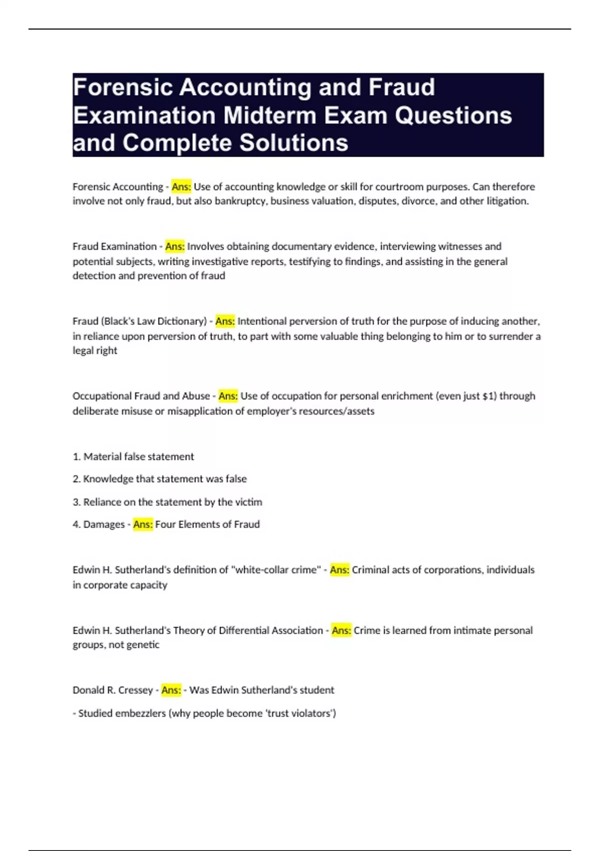 Forensic Accounting and Fraud Examination Midterm Exam Questions and Complete Solutions