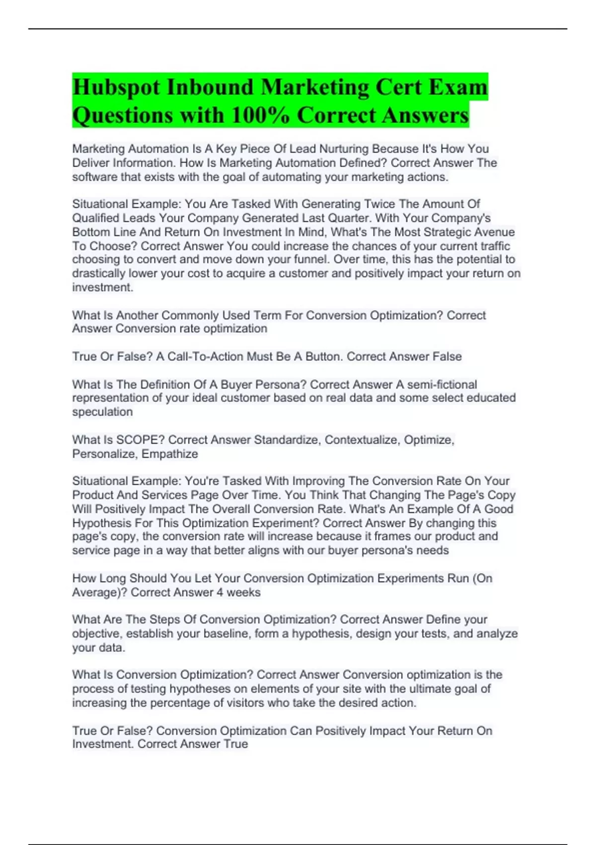 Hubspot Inbound Marketing Cert Exam Questions with 100% Correct Answers