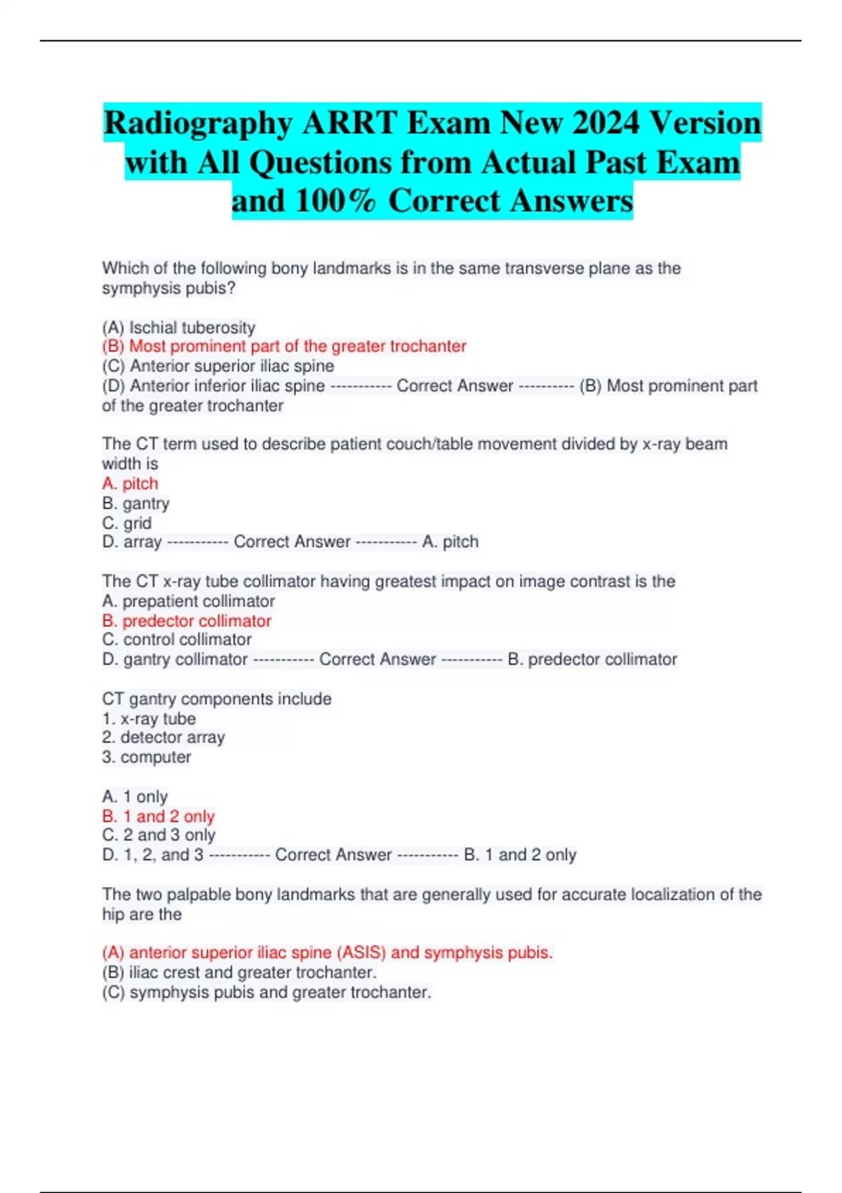 Radiography ARRT Exam New 2024 Version with All Questions from Actual Past Exam and 100% Correct Answers