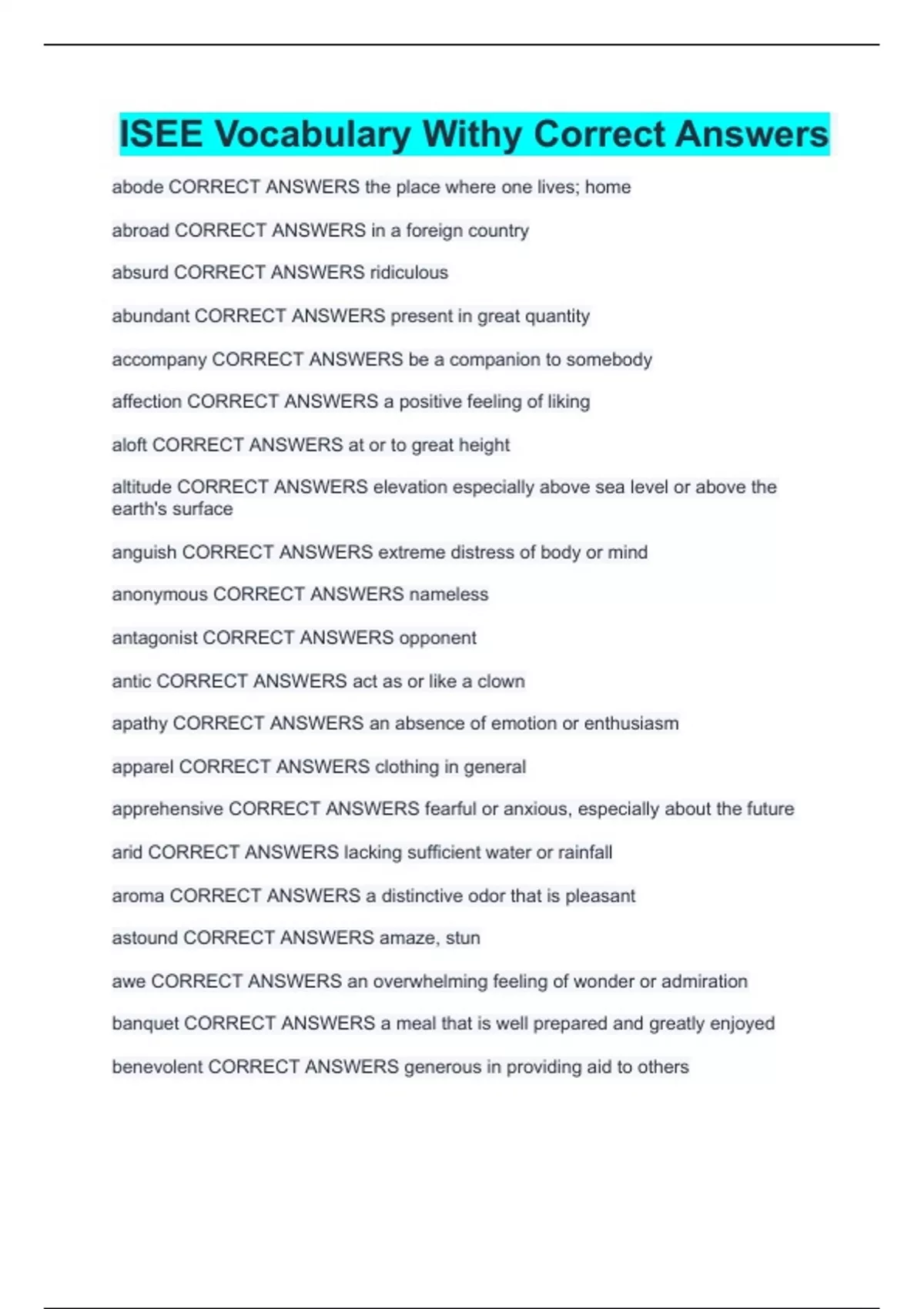 ISEE Vocabulary Withy Correct Answers