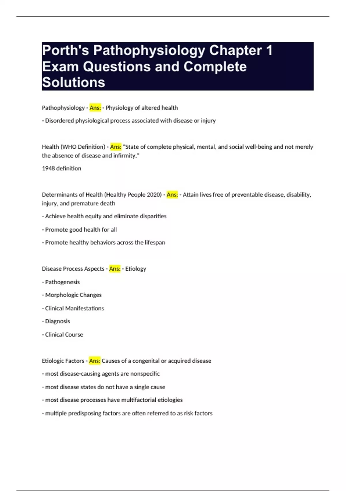Porth's Pathophysiology Chapter 1 Exam Questions and Complete Solutions Pathophysiology - Ans: - Physiology of altered health - Disordered physiological process associated with disease or injury Health (WHO Definition) - Ans: "State of complete physical, mental, and social well-being and not merely the absence of disease and infirmity." 1948 definition Determinants of Health (Healthy People 2020) - Ans: - Attain lives free of preventable disease, disability, injury, and premature death - Achieve health equity and eliminate disparities - Promote good health for all - Promote healthy behaviors across the lifespan Disease Process Aspects - Ans: - Etiology - Pathogenesis - Morphologic Changes - Clinical Manifestations - Diagnosis - Clinical Course Etiologic Factors - Ans: Causes of a congenital or acquired disease - most disease-causing agents are nonspecific - most disease states do not have a single cause - most disease processes have multifactorial etiologies - multiple predisposing factors are often referred to as risk factors Recognized Etiologic Factors - Ans: - biologic agents (e.g., bacteria, viruses); - physical forces (e.g., trauma, burns, radiation); - chemical agents (e.g., poisons, ethanol); - genetic inheritance; and - nutritional excesses or deficits Pathogenesis - Ans: Evolution of the disease process - Sequence of cellular and tissue events from the time of initial contact with the etiologic agent until the disease is expressed Morphology - Ans: Study of the fundamental structure or form of cells or tissues - Concerned with both the gross anatomic and microscopic changes that characterize a disease Clinical Manifestations - Ans: Signs and symptoms describe the structural and functional changes that accompany a disease Diagnosis - Ans: Designation as to the nature or cause of a health problem (disease or disorder) Diagnostic Process - Ans: - Careful History - Physical Exam - Laboratory Testing Clinical Course - Ans: Describes the evolution of a disease Risk Factors - Ans: Multiple predisposing factors Histology - Ans: Study of the cells and extracellular matrix of body tissues - Preparation of histologic sections --thin, translucent sections of human tissues and organs examined with the aid of a microscope- is a common method Lesions - Ans: Pathologic or traumatic discontinuity of body tissue or organ - Often subject to morphologic and/or histologic study Sign - Ans: Manifestation of disease or disorder noted by an observer (Objective assessment) Symptom - Ans: Subjective complaint noted by the person with the disease or disorder - Noted in chart in the CC and HPI Syndrome - Ans: Compilation of signs and symptoms characteristic of a specific disease state (i.e. Irritable Bowel Syndrome) Complications - Ans: Potential or actual adverse extension of a disease or disorder, or outcomes from treatment Sequelae - Ans: Impairments that follow or are caused by a disease Congenital vs Acquired - Ans: Present at the time of birth vs. Acquired from the environment Acute Course - Ans: Relatively severe but self-limiting Chronic Course - Ans: Continuous, long-term process ~ may run a continuous course or can present with exacerbations (aggravation of symptoms and severity of disease) and remissions (periods of time in which there is a decrease in severity and symptoms) Subacute Course - Ans: Intermediate between acute and chronic ~ not as severe as an acute disease and not as prolonged as a chronic disease Epidemiology - Ans: Study of disease occurrence in human populations - Originally intended to explain the spread of infectious diseases during epidemics; now a science to study risk factors for multifactorial diseases (e.g., obesity, diabetes, cardiac disease, cancer) - Looks for patterns in affected individuals (e.g., age, gender, race, ethnicity, socioeconomic status, dietary habits, lifestyle, geographic location) that may affect disease occurrence or severity Incidence - Ans: Number of new cases arising in a population at risk during a specified time Prevalence - Ans: Measure of existing disease in a population at a given point in time (e.g., number of existing cases divided by the current population) Morbidity - Ans: Describes the effects of a disease or disorder on an individual's life - Morbidity statistics are provided as the incidence of specific disease or disorder in a given population - Concerned not only with incidence (occurrence) but with persistence and long-term consequences of a disease or disorder Mortality - Ans: Statistics provide information about the cause of death (etiology) in a given population - The mortality rate is most often expressed as death rates for a specific population Primary Levels of Care - Ans: Prevents disease from occurring - Directed at removing all disease risk factors - Occurs mostly at community level - Ex: Childhood immunizations, Seatbelt Use, Use of Helmets Secondary Level of Care - Ans: Detects and cures disease in the asymptomatic phase - Aim is to diagnose disease or disorder in its early stages, while still asymptomatic - Implement treatment measures that can yield a cure or stop the disease or disorder from progressing - Ex: Diabetes screening, Cholesterol screening, Depression screening Tertiary Level of Care - Ans: Reduces complications of disease - Goal is to implement clinical interventions to prevent further deterioration or reduce complications once a disease or disorder has been diagnosed - Ex: Allergen eliminates for asthmatics, chronic pain mgmt programs