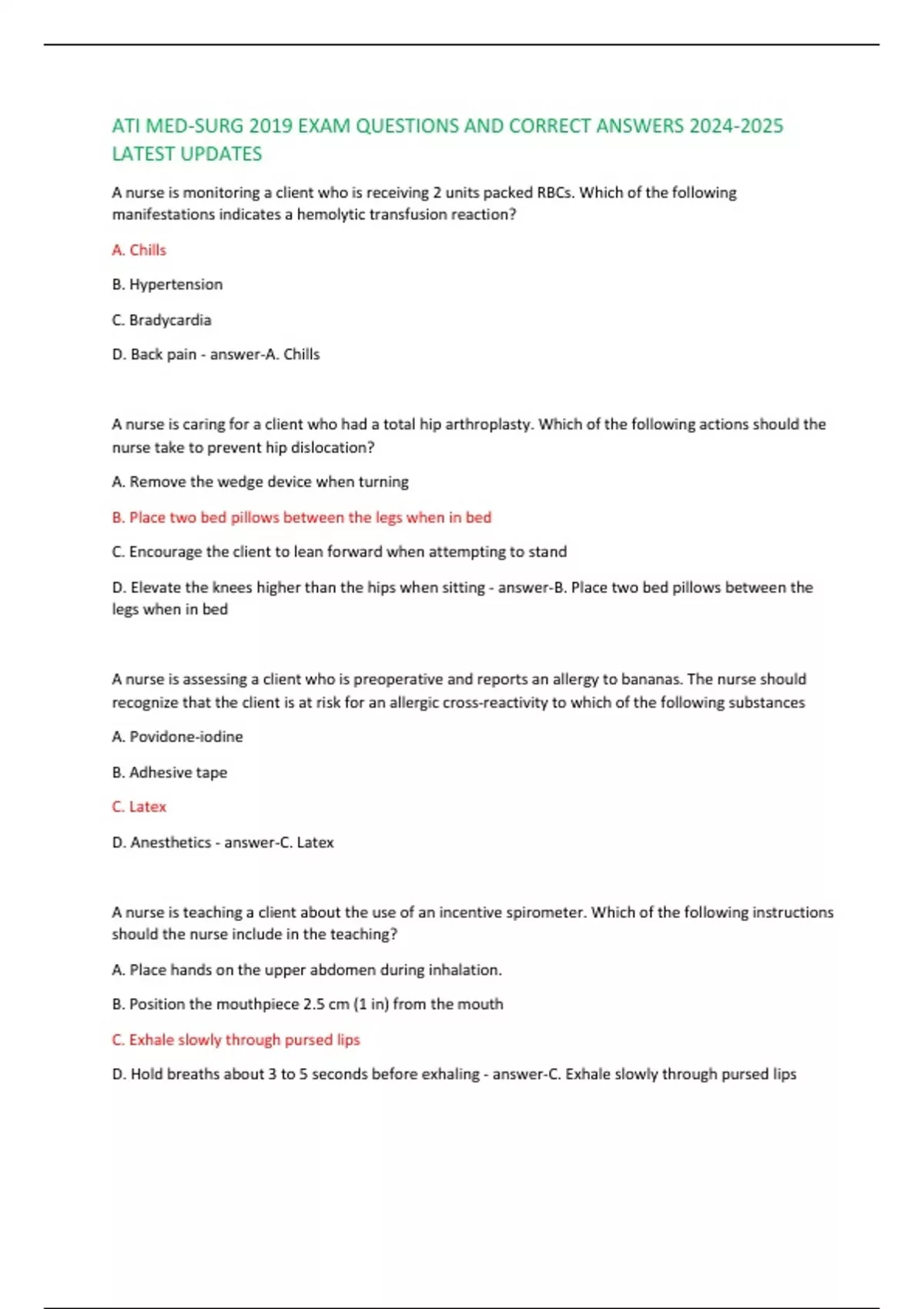 ATI MED-SURG 2019 EXAM QUESTIONS AND CORRECT ANSWERS LATEST UPDATES A nurse is monitoring a client who is receiving 2 units packed RBCs. Which of the following manifestations indicates a hemolytic transfusion reaction? ATI MED-SURG 2019 EXAM QUESTIONS AND CORRECT ANSWERS LATEST UPDATES A nurse is monitoring a client who is receiving 2 units packed RBCs. Which of the following manifestations indicates a hemolytic transfusion reaction?