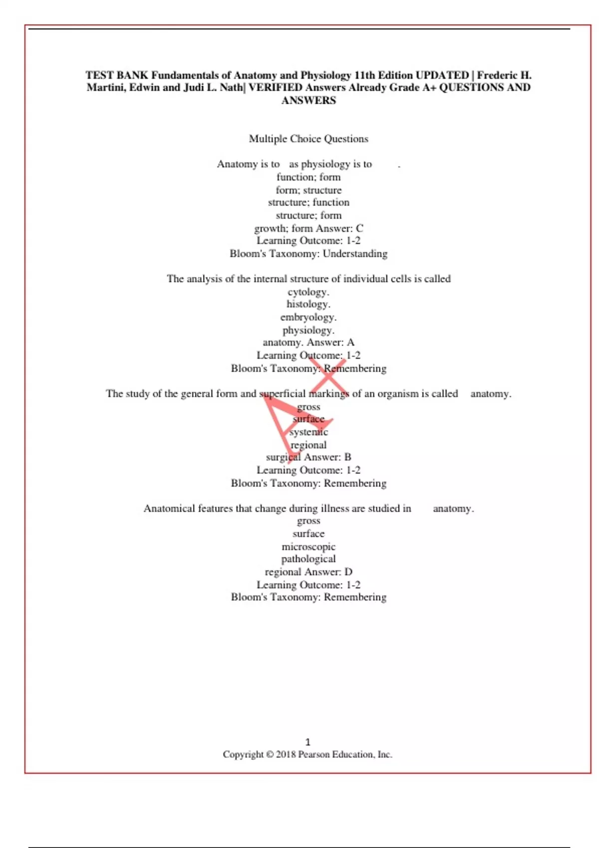 TEST BANK Fundamentals of Anatomy and Physiology 11th Edition UPDATED | Frederic H. Martini, Edwin and Judi L. Nath| VERIFIED Answers Already Grade A+ QUESTIONS AND ANSWERS Multiple Choice Questions Anatomy is to as physiology is to . function; form form; structure structure; function structure; form growth; form Answer: C Learning Outcome: 1-2 Bloom's Taxonomy: Understanding The analysis of the internal structure of individual cells is called cytology. histology. embryology. physiology. anatomy. Answer: A Learning Outcome: 1-2 Bloom's Taxonomy: Remembering The study of the general form and superficial markings of an organism is called anatomy. gross surface systemic