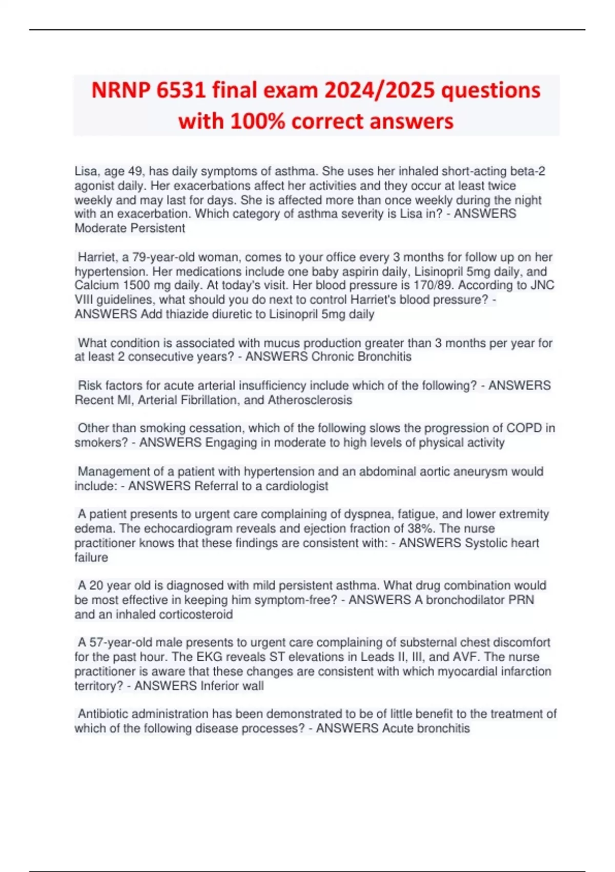 NRNP 6531 final exam 2024/2025 questions with 100% correct answers Lisa, age 49, has daily symptoms of asthma. She uses her inhaled short-acting beta-2 agonist daily. Her exacerbations affect her activities and they occur at least twice weekly and may last for days. She is affected more than once weekly during the night with an exacerbation. Which category of asthma severity is Lisa in? - ANSWERS Moderate Persistent Harriet, a 79-year-old woman, comes to your office every 3 months for follow up on her hypertension. Her medications include one baby aspirin daily, Lisinopril 5mg daily, and Calcium 1500 mg daily. At today's visit. Her blood pressure is 170/89. According to JNC VIII guidelines, what should you do next to control Harriet's blood pressure? - ANSWERS Add thiazide diuretic to Lisinopril 5mg daily What condition is associated with mucus production greater than 3 months per year for at least 2 consecutive years? - ANSWERS Chronic Bronchitis Risk factors for acute arterial insufficiency include which of the following? - ANSWERS Recent MI, Arterial Fibrillation, and Atherosclerosis Other than smoking cessation, which of the following slows the progression of COPD in smokers? - ANSWERS Engaging in moderate to high levels of physical activity Management of a patient with hypertension and an abdominal aortic aneurysm would include: - ANSWERS Referral to a cardiologist A patient presents to urgent care complaining of dyspnea, fatigue, and lower extremity edema. The echocardiogram reveals and ejection fraction of 38%. The nurse practitioner knows that these findings are consistent with: - ANSWERS Systolic heart failure A 20 year old is diagnosed with mild persistent asthma. What drug combination would be most effective in keeping him symptom-free? - ANSWERS A bronchodilator PRN and an inhaled corticosteroid A 57-year-old male presents to urgent care complaining of substernal chest discomfort for the past hour. The EKG reveals ST elevations in Leads II, III, and AVF. The nurse practitioner is aware that these changes are consistent with which myocardial infarction territory? - ANSWERS Inferior wall Antibiotic administration has been demonstrated to be of little benefit to the treatment of which of the following disease processes? - ANSWERS Acute bronchitis The most common correlate(s) with chronic bronchitis and emphysema is(are): - ANSWERS Cigarette smoke inhalation Which of the following is not a goal of treatment for the patient with cystic fibrosis? - ANSWERS Replacement of water soluble vitamins Which drug category contains the drugs that are the first line Gold standard therapy for COPD? - ANSWERS Inhaled beta-2 agonist bronchodilators Which of the following patient characteristics are associated with chronic bronchitis? - ANSWERS Normal weight, cyanosis, and greatly increased RR Salmeterol (Servent) is prescribed for a patient with asthma. What is the most important teaching point about this medication? - ANSWERS It is not effective during an acute asthma attack Which of the following is not a risk factor for coronary arterial insufficiency? - ANSWERS Alcohol ingestion Which type of lung cancer has the poorest prognosis? - ANSWERS Small cell carcinoma A patient presents to the office with a blood pressure 142/80. This patient is classified as having: - ANSWERS Stage 1 hypertension In order to decrease deaths from lung cancer: - ANSWERS Patients should be counseled to quit smoking Which of the following medication classes should be avoided in patients with acute or chronic bronchitis because it will contribute to ventilation-perfusion mismatch in the patient? - ANSWERS Antihistamines Diagnostic confirmation of acute leukemia is based on: - ANSWERS Bone marrow aspiration & biopsy Which of the following are classic features of ulcerative colitis? - ANSWERS Remissions and exacerbations of bloody diarrhea, tenesmus, fecal incontinence, abdominal pain, and weight loss Reed-Sternberg B lymphocytes are associated with which of the following disorders: - ANSWERS Hodgkin's lymphoma Which of the following is not appropriate suppression therapy for chronic bacterial prostatitis? - ANSWERS Erythromycin daily A patient has been diagnosed with hypothyroidism and thyroid hormone replacement therapy is prescribed. How long should the nurse practitioner wait before checking the patient's TSH? - ANSWERS 8 weeks After thorough history, physical examination, and laboratory tests, a patient is diagnosed with irritable bowel syndrome (IBS). Which of the following initial treatment plans is currently considered most effective? - ANSWERS A low fat, thyramine-free, caffeine-free, high fiber diet, along with a daily diary, and attention to psychosocial factors What is the most common cause of Cushing's syndrome? - ANSWERS Administration of a glucocorticoid or ACTH Steve, age 69, has gastroesophageal reflux disease (GERD). When teaching him how to reduce his lower esophageal sphincter pressure, which substances do you recommend that he avoid? - ANSWERS Peppermint Microalbuminur