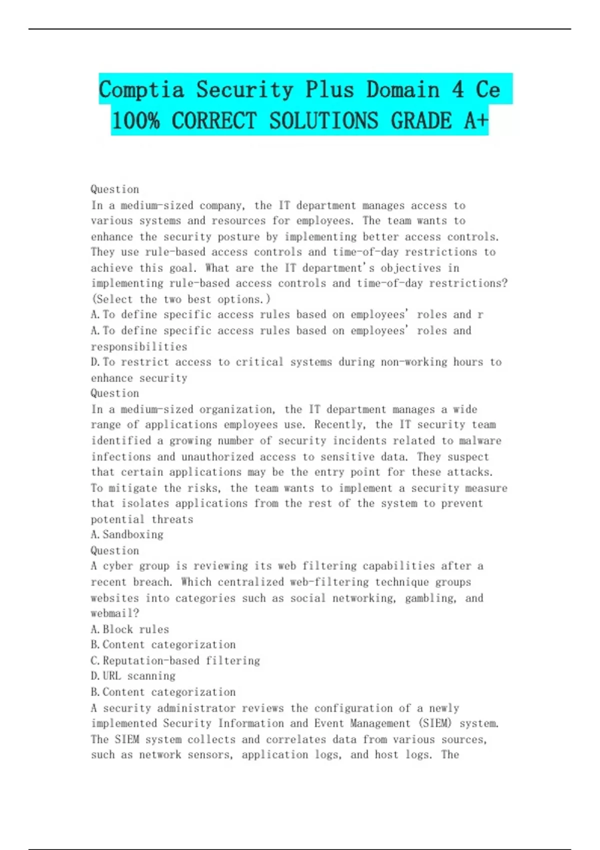 Question In a medium-sized company, the IT department manages access to various systems and resources for employees. The team wants to enhance the security posture by implementing better access controls. They use rule-based access controls and time-of-day restrictions to achieve this goal. What are the IT department's objectives in implementing rule-based access controls and time-of-day restrictions? (Select the two best options.) A.To define specific access rules based on employees' roles and r A.To define specific access rules based on employees' roles and responsibilities D.To restrict access to critical systems during non-working hours to enhance security Question In a medium-sized organization, the IT department manages a wide range of applications employees use. Recently, the IT security team identified a growing number of security incidents related to malware infections and unauthorized access to sensitive data. They suspect that certain applications may be the entry point for these attacks. To mitigate the risks, the team wants to implement a security measure that isolates applications from the rest of the system to prevent potential threats A.Sandboxing Question A cyber group is reviewing its web filtering capabilities after a recent breach. Which centralized web-filtering technique groups websites into categories such as social networking, gambling, and webmail? A.Block rules B.Content categorization C.Reputation-based filtering D.URL scanning B.Content categorization A security administrator reviews the configuration of a newly implemented Security Information and Event Management (SIEM) system. The SIEM system collects and correlates data from various sources, such as network sensors, application logs, and host logs. The administrator notices that some network devices, like switches and routers, do not directly support the installed agents for data collection. What approach should the administrator consider to ensure the inclusion of these devices' logs i A.Configuring the devices to push log changes to the SIEM server using a listener/collector approach Question An organization wants to enhance its cybersecurity by implementing web filtering. The company needs a solution that provides granular control over web traffic, ensures policy enforcement even when employees are off the corporate network, and can log and analyze Internet usage patterns. Which of the following strategies BEST meets these requirements? A.Reputation-based filtering B.Centralized web filtering C.Manual URL blockingD.Agent-based filtering D.Agent-based filtering D.Agent-based filtering Question A financial institution is preparing to decommission a number of its old servers. The servers contain sensitive customer data that needs proper handling to prevent unauthorized access or data breaches. Which strategy should the institution primarily employ to ensure the data on these servers stays irretrievable? A.Use a basic method of overwriting, such as zero filling, once. B.Leave the data on the servers, as the system will eventually overwrite it. C.Carry out a sanitization process C.Carry out a sanitization process that includes multiple passes of overwriting and degaussing. Question The chief information officer (CIO) wants to expand the company's ability to accurately identify vulnerabilities across the company. The CIO wants to be able to scan client PCs, mobile devices, servers, routers, and switches. What type of scanner are they looking to institute? A.Network vulnerability scanner B.Package monitoring C.Credentialed scan D.Dynamic analysis A.Network vulnerability scanner Question A tech department reviews the current model for incident response procedures in response to a serious incident at the company. What part of the process should they focus on for a review of data to determine the legitimacy of a genuine incident? A.Analysis B.Containment C.Eradication D.Detection A Analysis D.Detection (Not) Question A company's network has experienced increased infiltration due to employees accessing dangerous websites from different content categories. The company has decided to enhance its security by implementing reputation-based filtering and content categorization in its web filtering system. Which of the following BEST compares these features? A.Reputation-based filtering sorts by content themes; content categorization rates by past behaviors. B.Reputation-based filtering permits executable C. Reputation-based filtering evaluates sites by past behavior; content categorization sorts by themes like adult content. Reputation-based filtering assesses websites based on their historical behavior and reputation, while content categorization categorizes websites into thematic categories such as adult content, social media, etc. This comparison accurately describes the primary focus and purpose of each of these features. A digital forensics analyst at a healthcare company is investigating a case involving a potential internal data breach. The breach has led to unauthorized access and potential exposure of sensitive patient information. The company uses a Security Information and Event Management (SIEM) tool that aggregates and correlates data from multiple sources. The analyst's task is to identify potential insider threats that could be responsible for the breach. Given the nature of the breach, which combinati D.(Correct)Investigate log files generated by the OS components of client and server host computers, logs generated by applications, services running on hosts, and endpoint logs. A hacker successfully bypasses several protections and exfiltrates sensitive data. The company immediately begins recovery and takes steps to discover the initial problem that allowed the infiltration. This type of investigation is commonly referred to as what? A.Lessons learned B.Analysis C.Recovery D.Root cause analysis D.Root cause analysis Question A global financial institution with a vast network of offices and data centers ha
