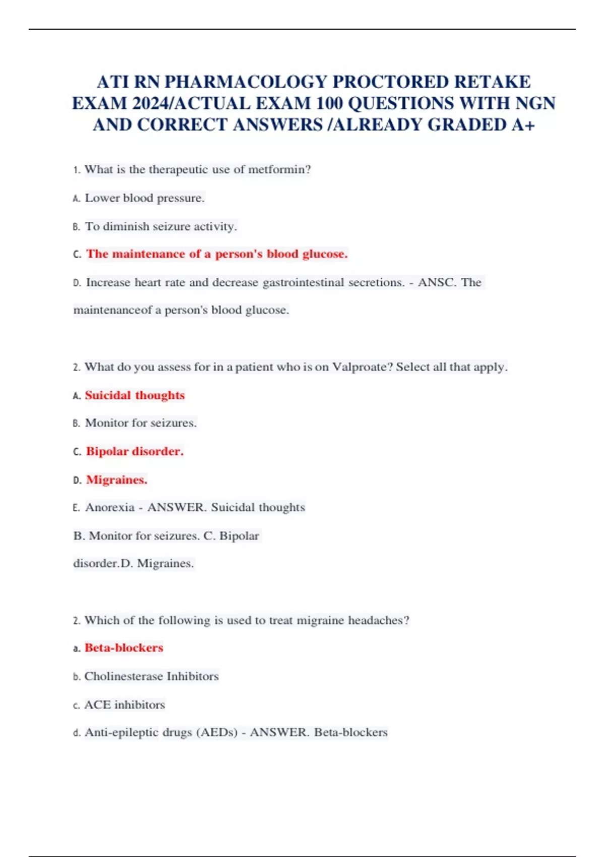 ATI RN PHARMACOLOGY PROCTORED RETAKE EXAM 2024/ACTUAL EXAM 100 QUESTIONS WITH NGN AND CORRECT ANSWERS /ALREADY GRADED A+