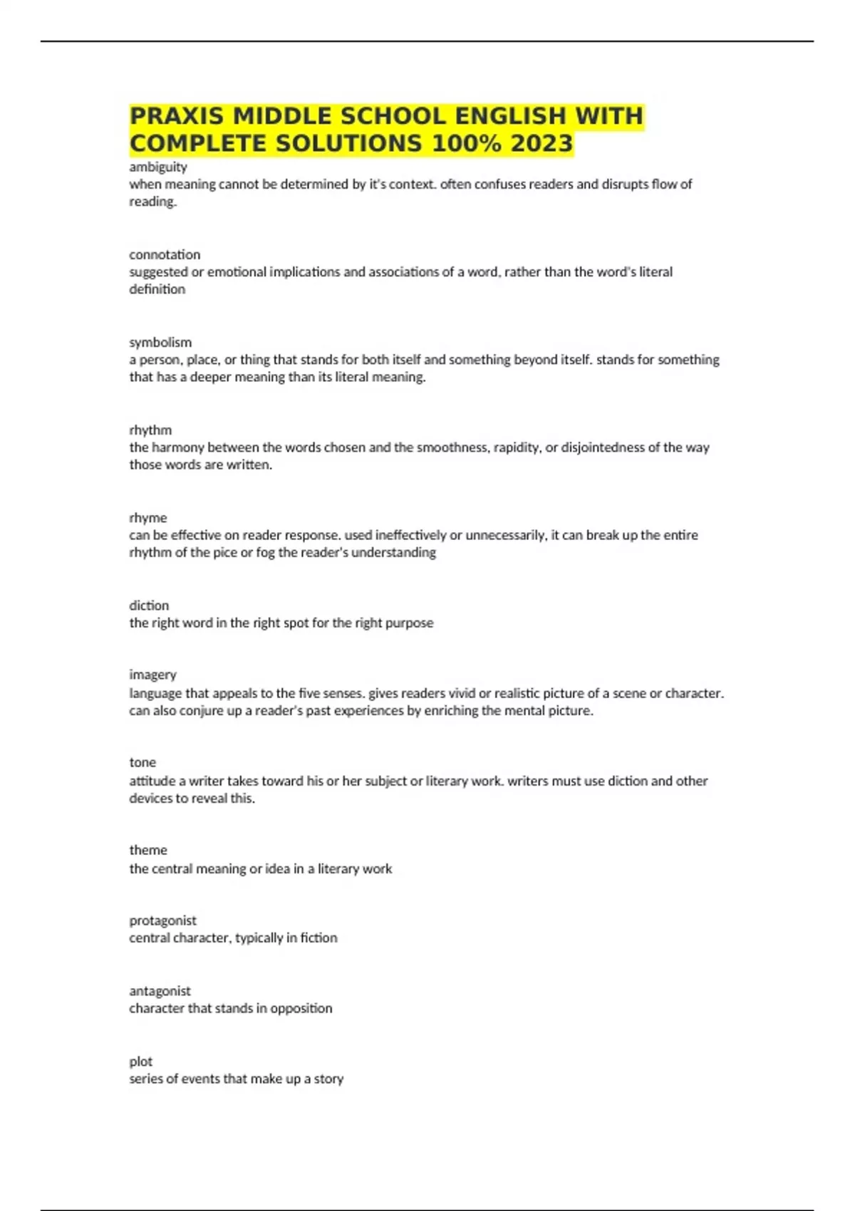 PRAXIS MIDDLE SCHOOL ENGLISH WITH COMPLETE SOLUTIONS 100% 2023 ambiguity when meaning cannot be determined by it's context. often confuses readers and disrupts flow of reading. connotation suggested or emotional implications and associations of a word, rather than the word's literal definition symbolism a person, place, or thing that stands for both itself and something beyond itself. stands for something that has a deeper meaning than its literal meaning. rhythm the harmony between the words chosen and the smoothness, rapidity, or disjointedness of the way those words are written. rhyme can be effective on reader response. used ineffectively or unnecessarily, it can break up the entire rhythm of the pice or fog the reader's understanding diction the right word in the right spot for the right purpose imagery language that appeals to the five senses. gives readers vivid or realistic picture of a scene or character. can also conjure up a reader's past experiences by enriching the mental picture. tone attitude a writer takes toward his or her subject or literary work. writers must use diction and other devices to reveal this. theme the central meaning or idea in a literary work protagonist central character, typically in fiction antagonist character that stands in opposition plot series of events that make up a story static character does not change much during a story (type of character)