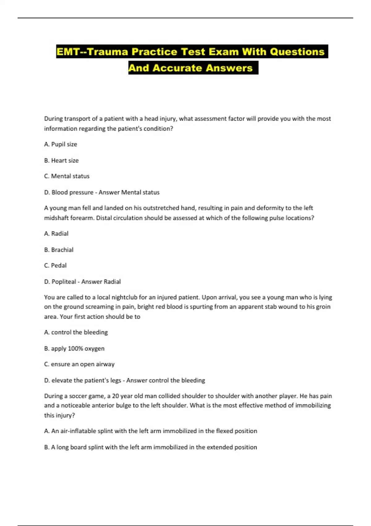 EMT--Trauma Practice Test Exam With Questions And Accurate Answers ...