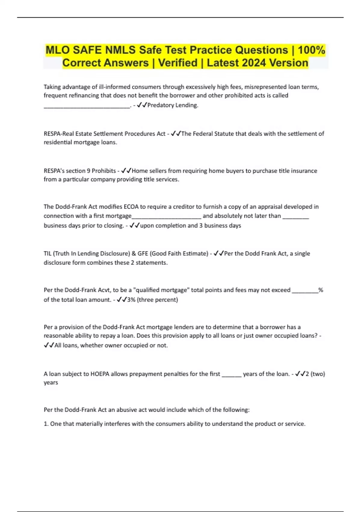 MLO SAFE NMLS Safe Test Practice Questions | 100% Correct Answers | Verified | Latest 2024 Version