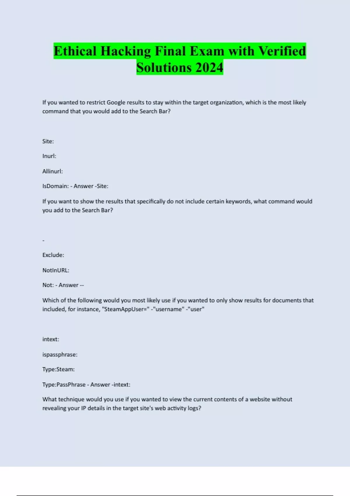 Ethical Hacking Final Exam with Verified Solutions 2024 If you wanted to restrict Google results to stay within the target organization, which is the most likely command that you would add to the Search Bar? Site: Inurl: Allinurl: IsDomain: - Answer -Site: If you want to show the results that specifically do not include certain keywords, what command would you add to the Search Bar? - Exclude: NotInURL: Not: - Answer -- Which of the following would you most likely use if you wanted to only show results for documents that included, for instance, "SteamAppUser=" -"username" -"user" intext: ispassphrase: Type:Steam: Type:PassPhrase - Answer -intext: What technique would you use if you wanted to view the current contents of a website without revealing your IP details in the target site's web activity logs?&strip=1 Right Click the 'cache button' Browse in Incognito Mode WayBack Machine - Answer -&strip=1 If you were looking for an Apache Status page, what command would you most likely add to the Google Search Bar? intitle: intext: