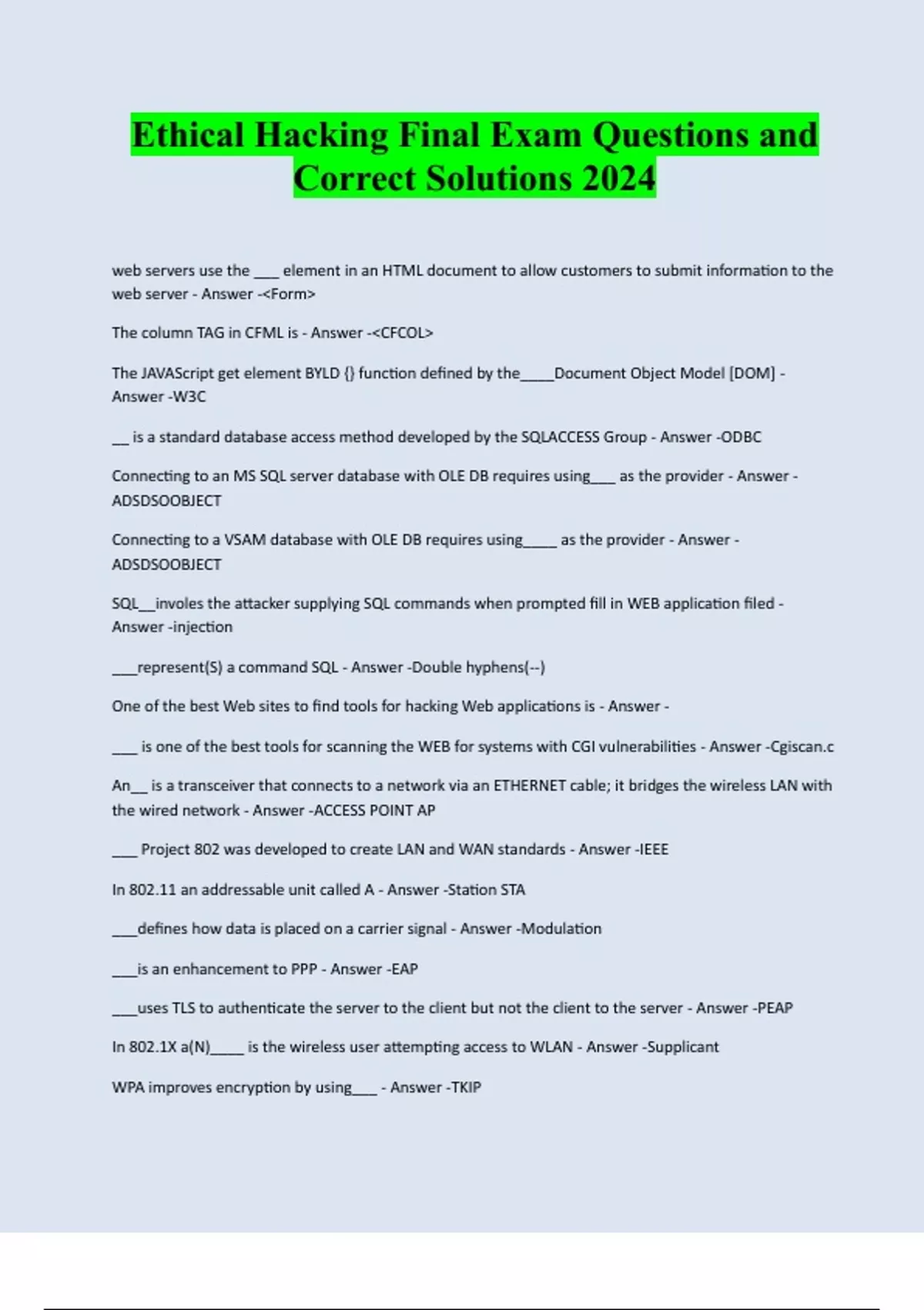 Ethical Hacking Final Exam Questions and Correct Solutions 2024