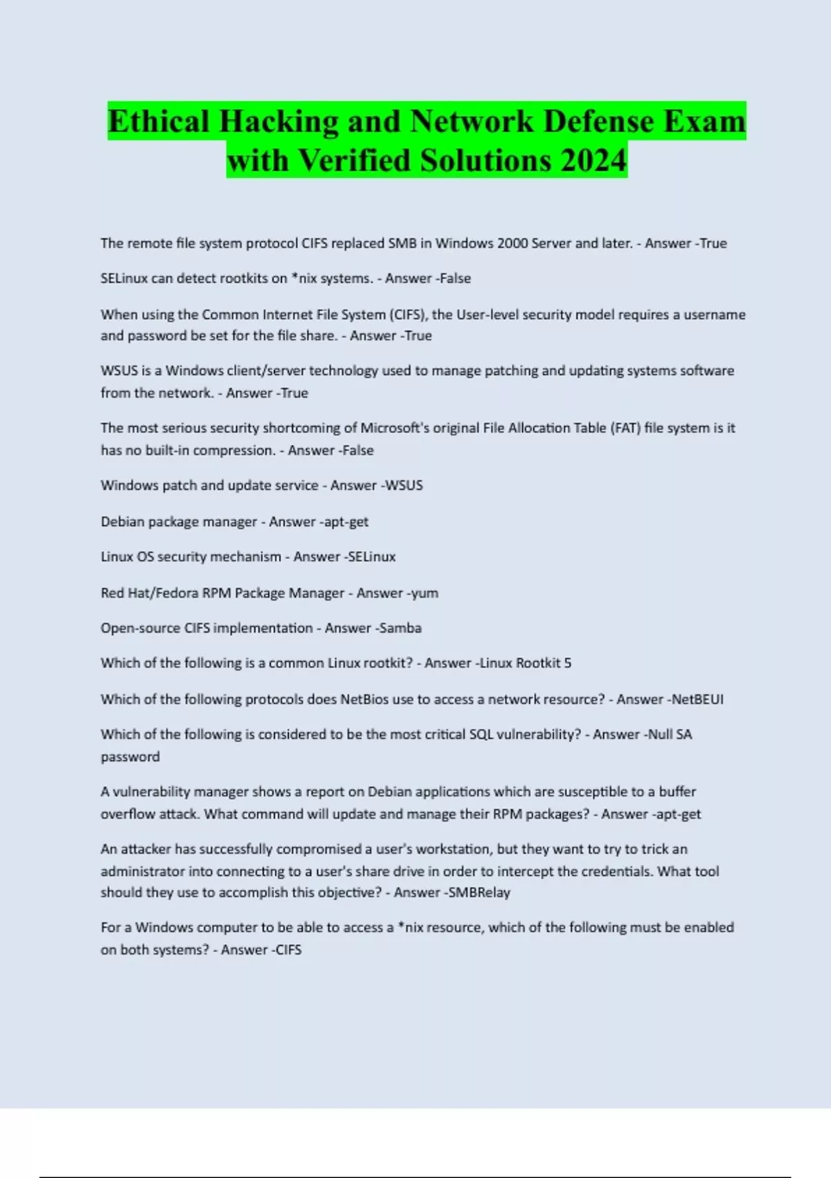 Ethical Hacking and Network Defense Exam with Verified Solutions 2024 The remote file system protocol CIFS replaced SMB in Windows 2000 Server and later. - Answer -True SELinux can detect rootkits on *nix systems. - Answer -False When using the Common Internet File System (CIFS), the User-level security model requires a username and password be set for the file share. - Answer -True WSUS is a Windows client/server technology used to manage patching and updating systems software from the network. - Answer -True The most serious security shortcoming of Microsoft's original File Allocation Table (FAT) file system is it has no built-in compression. - Answer -False Windows patch and update service - Answer -WSUS Debian package manager - Answer -apt-get Linux OS security mechanism - Answer -SELinux Red Hat/Fedora RPM Package Manager - Answer -yum Open-source CIFS implementation - Answer -Samba Which of the following is a common Linux rootkit? - Answer -Linux Rootkit 5 Which of the following protocols does NetBios use to access a network resource? - Answer -NetBEUI Which of the following is considered to be the most critical SQL vulnerability? - Answer -Null SA password A vulnerability manager shows a report on Debian applications which are susceptible to a buffer overflow attack. What command will update and manage their RPM packages? - Answer -apt-get An attacker has successfully compromised a user's workstation, but they want to try to trick an administrator into connecting to a user's share drive in order to intercept the credentials. What tool should they use to accomplish this objective? - Answer -SMBRelay For a Windows computer to be able to access a *nix resource, which of the following must be enabled on both systems? - Answer -CIFSA Linux administrator wants to share files between Windows and Linux servers. What protocol shoul