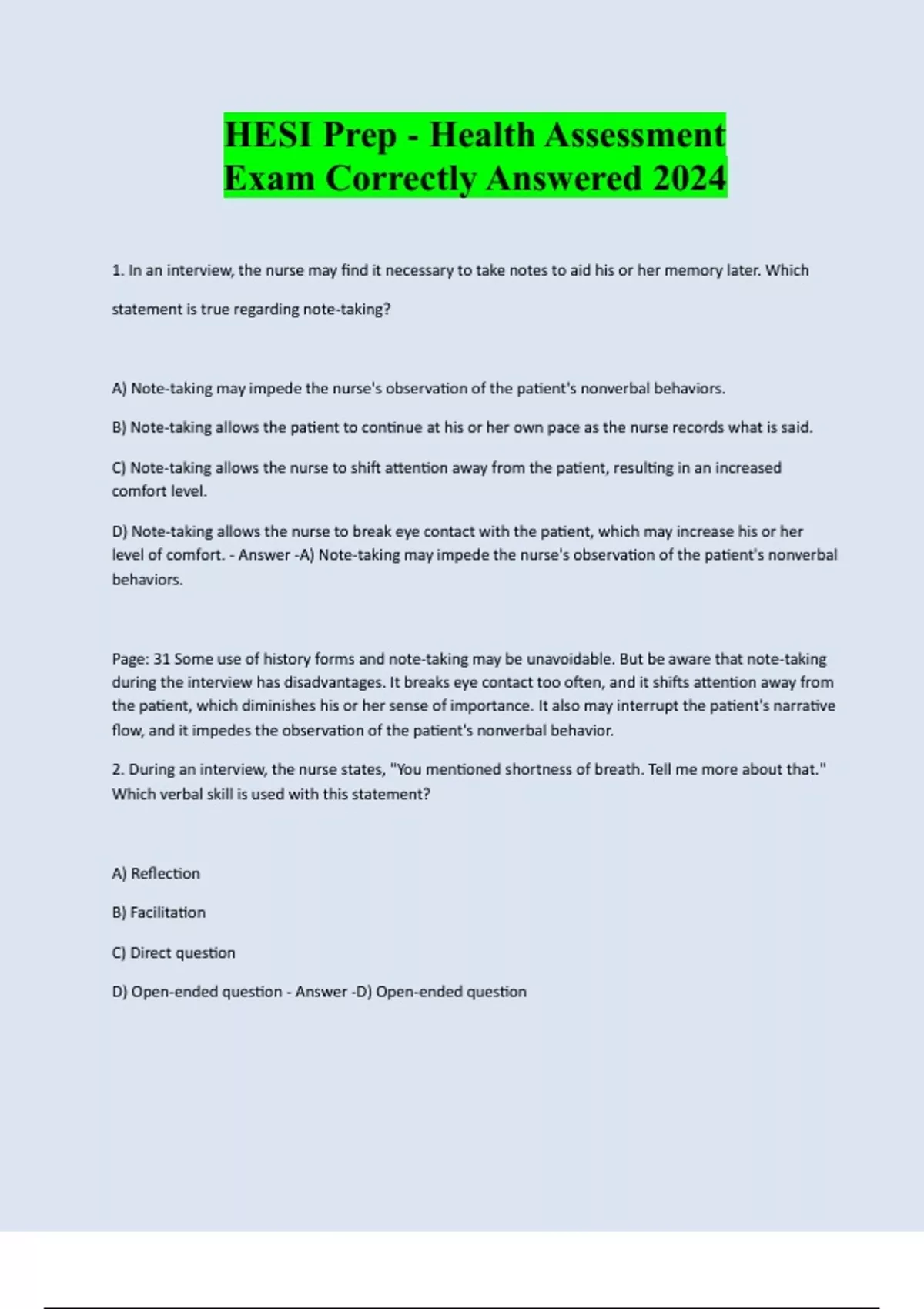 HESI Prep - Health Assessment Exam Correctly Answered 2024 1. In an interview, the nurse may find it necessary to take notes to aid his or her memory later. Which statement is true regarding note-taking? A) Note-taking may impede the nurse's observation of the patient's nonverbal behaviors. B) Note-taking allows the patient to continue at his or her own pace as the nurse records what is said. C) Note-taking allows the nurse to shift attention away from the patient, resulting in an increased comfort level. D) Note-taking allows the nurse to break eye contact with the patient, which may increase his or her level of comfort. - Answer -A) Note-taking may impede the nurse's observation of the patient's nonverbal behaviors. Page: 31 Some use of history forms and note-taking may be unavoidable. But be aware that note-taking during the interview has disadvantages. It breaks eye contact too often, and it shifts attention away from the patient, which diminishes his or her sense of importance. It also may interrupt the patient's narrative flow, and it impedes the observation of the patient's nonverbal behavior. 2. During an interview, the nurse states, "You mentioned shortness of breath. Tell me more about that." Which verbal skill is used with this statement? A) Reflection B) Facilitation C) Direct question D) Open-ended question - Answer -D) Open-ended questionPage: 32 The open-ended question asks for narrative information. It states the topic to be discussed but only in general terms. The nurse should use it to begin the interview, to introduce a new section of questions, and whenever the person introduces a new topic. 3. A nurse is taking complete health histories on all of the patients attending a wellness workshop. On the history form, one of the written questions asks, "You don't smoke, drink, or take drugs, do you?" This question is an example of: A) talking too much. B) using confrontation. C) using biased or leading questions. D) using blunt language to deal with distasteful topics. - Answer -C) using biased or leading questions. Page: 36 This is an example of using leading or biased questions. Asking, "You don't smoke, do you?