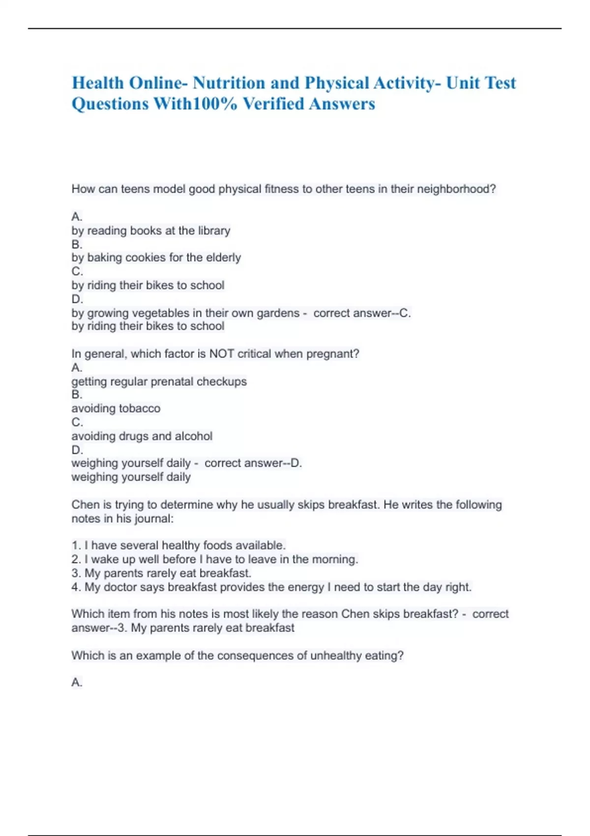How can teens model good physical fitness to other teens in their neighborhood? A. by reading books at the library B. by baking cookies for the elderly C. by riding their bikes to school D. by growing vegetables in their own gardens - correct answer--C. by riding their bikes to school In general, which factor is NOT critical when pregnant? A. getting regular prenatal checkups B. avoiding tobacco C. avoiding drugs and alcohol D. weighing yourself daily - correct answer--D. weighing yourself daily Chen is trying to determine why he usually skips breakfast. He writes the following notes in his journal: 1. I have several healthy foods available. 2. I wake up well before I have to leave in the morning. 3. My parents rarely eat breakfast. 4. My doctor says breakfast provides the energy I need to start the day right. Which item from his notes is most likely the reason Chen skips breakfast? - correct answer--3. My parents rarely eat breakfast Which is an example of the consequences of unhealthy eating? A. An adult female prevents bone loss by eating adequate amounts of vitamins and minerals. B. An active young adult is placed on medication to treat a sprained ankle. C. An obese young adult has been diagnosed with type 2 diabetes. D. An adult male has surgery to treat a disease that his parent passed on to him. - correct answer--C. An obese young adult has been diagnosed with type 2 diabetes. What is a short-term consequence of a sedentary lifestyle? A. high blood pressure B. decrease in flexibility C. diagnosed with being obese D. development of heart disease - correct answer--B. decrease in flexibility Which personal goal should Abigail incorporate into her plan for healthy eating? A. Exercise and eat a well-balanced diet when the feeling is right. B. Look for food options with a large amount of refined grains. C. Eliminate foods high in protein from her diet. D. Increase intake of foods rich in soluble and insoluble fiber. - correct answer--D. Increase intake of foods rich in soluble and insoluble fiber. Which friend is experiencing an internal barrier to physical fitness? A. Mark lacks access to fitness equipment. B. Tyler has trouble finding a safe area to work out. C. Talia puts in only 50 percent of effort during her workout. D. Clark's parents fail to support his desire to work out. - correct answer--C. Talia puts in only 50 percent of effort during her workout.