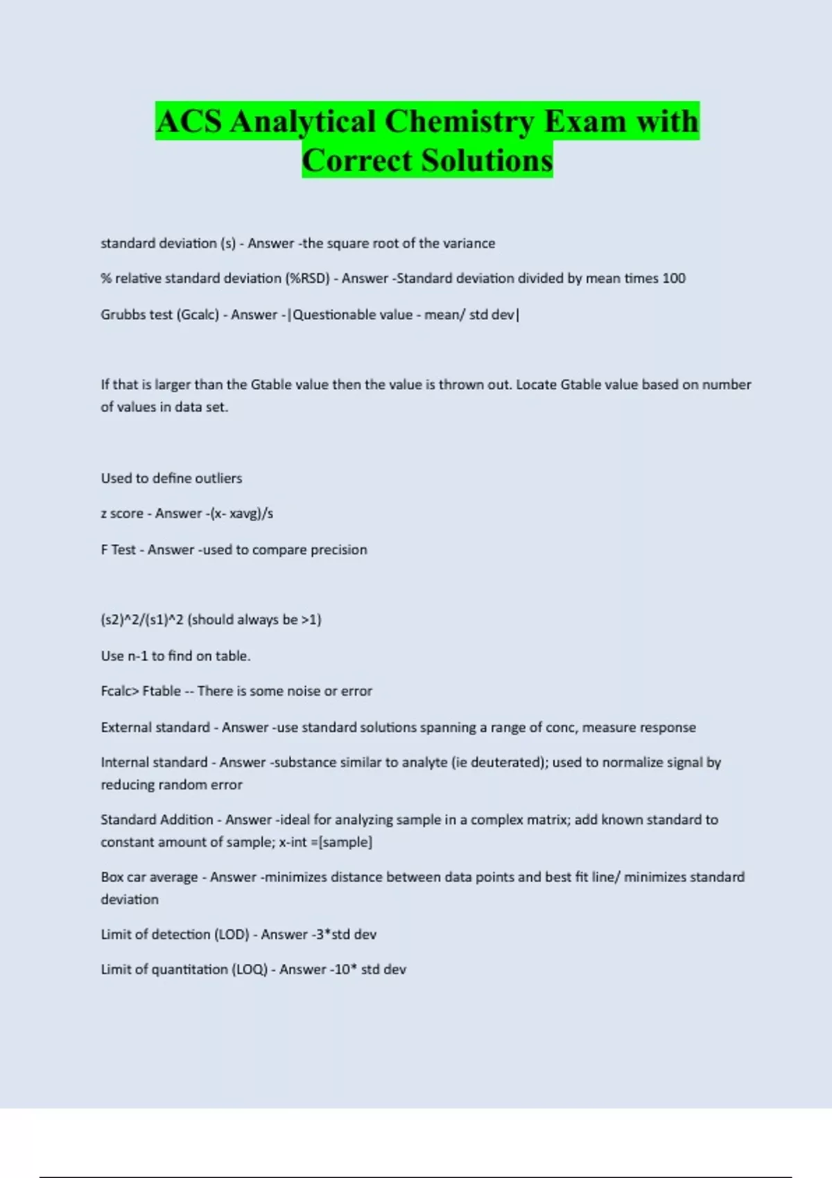 ACS Analytical Chemistry Exam with Correct Solutions standard deviation (s) - Answer -the square root of the variance % relative standard deviation (%RSD) - Answer -Standard deviation divided by mean times 100 Grubbs test (Gcalc) - Answer -|Questionable value - mean/ std dev| If that is larger than the Gtable value then the value is thrown out. Locate Gtable value based on number of values in data set. Used to define outliers z score - Answer -(x- xavg)/s F Test - Answer -used to compare precision (s2)^2/(s1)^2 (should always be >1) Use n-1 to find on table. Fcalc> Ftable -- There is some noise or error External standard - Answer -use standard solutions spanning a range of conc, measure response Internal standard - Answer -substance similar to analyte (ie deuterated); used to normalize signal by reducing random error Standard Addition - Answer -ideal for analyzing sample in a complex matrix; add known standard to constant amount of sample; x-int =[sample] Box car average - Answer -minimizes distance between data points and best fit line/ minimizes standard deviation Limit of detection (LOD) - Answer -3*std dev Limit of quantitation (LOQ) - Answer -10* std dev
