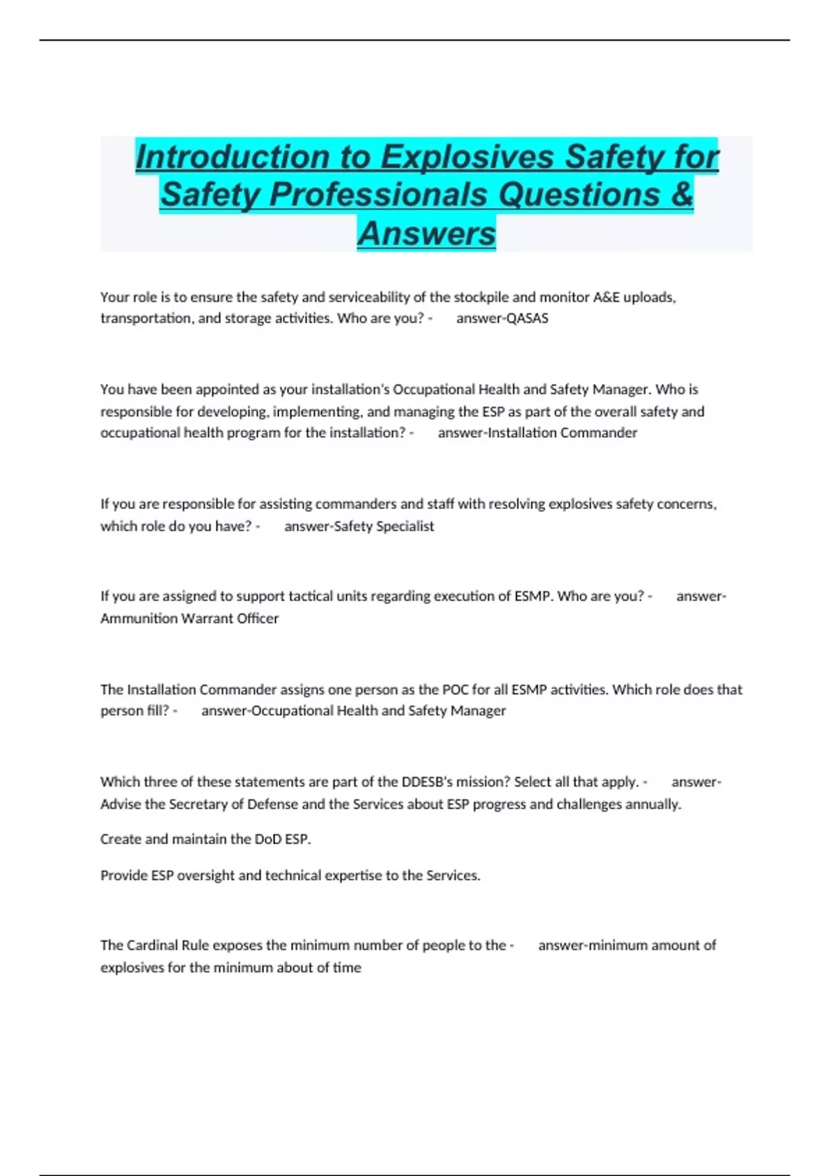 Introduction to Explosives Safety for Safety Professionals Questions & Answers